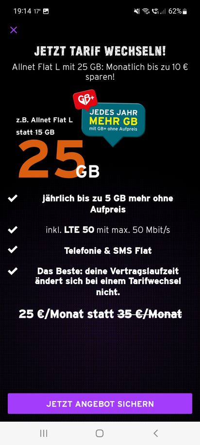 Leider ist der Tarifwechsel nicht möglich wie in der App angezeigt. Gilt nur für Online Kunden. Da ich den Vertrag im Handel abgeschlossen habe bin ich ein Kunde 2. Klasse und könnte es nicht in Anspruch nehmen obwohl ständig dafür Werbung bei meinem Zugang inderApp gemacht wird