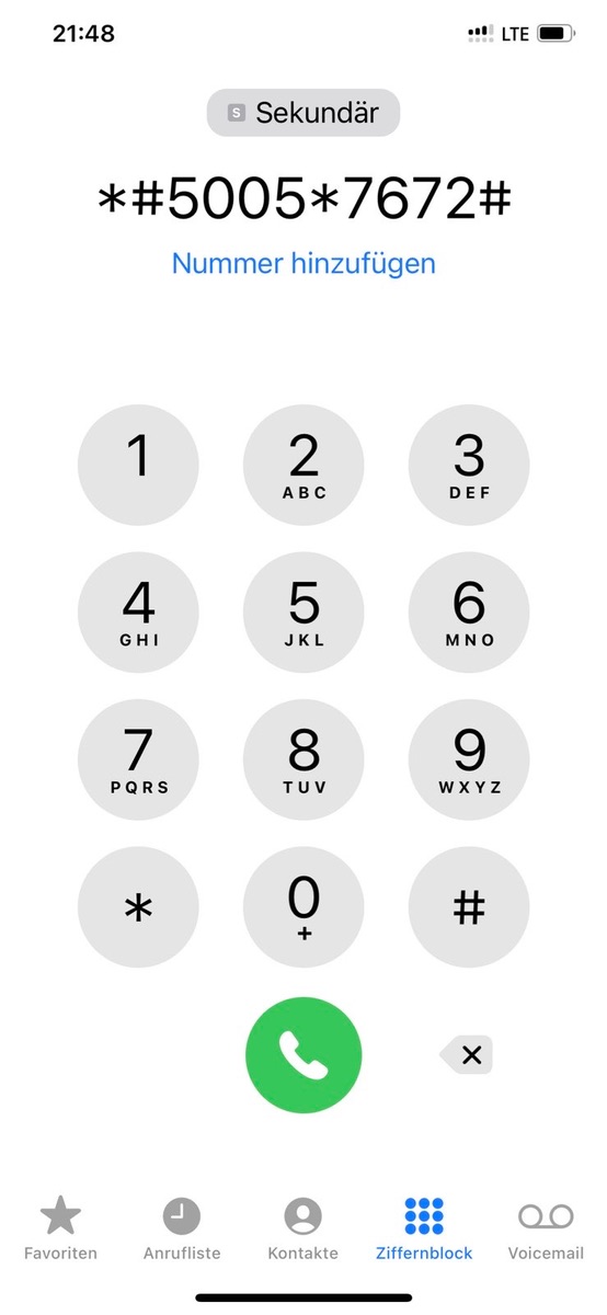*#5005*7672# über die Telefon App starten sollte. Das provoziert aber leider auch nur eine Fehlermeldung, siehe anbei.