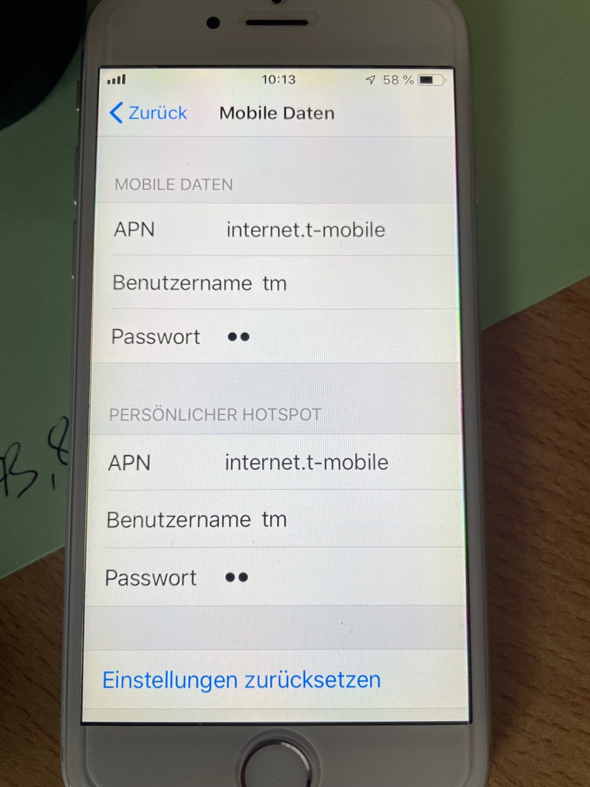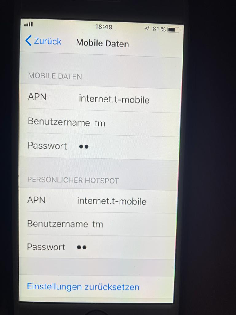 Hallo Zusammen! Ich habe die SIM in mein altes IPhone eingesetzt und wollte dann an der nutzungsadresse loslegen. Leider erfolglos. Den APN habe ich gemäß Anweisung von Internet.Telekom auf .t-mobile geändert und das Gerät neu gestartet, auch erfolglos. Es findet sich keine Möglichkeit, die Zugangsnummer anzugeben. Der telefonische Kundenservice war zwar sehr bemüht, hatte aber auch keine Lösung parat. Ich hoffe, dass mir hier noch jemand einen Tipp geben kann. :S