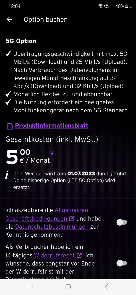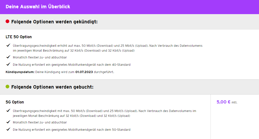 Richtig. Wenn du heute buchst, gilt die Option bis zum Ende des Monats und wird auch nur anteilig berechnet. Pro Tag 1/30. Du kannst sie am letzten des Monats in der App kündigen, zum 1 des neuen Monats gilt dann wieder dein alter Tarif. Also das Speed was du vor der 5G Option vertraglich vereinbart hast. Wobei es da auch noch Unklarheiten gibt.