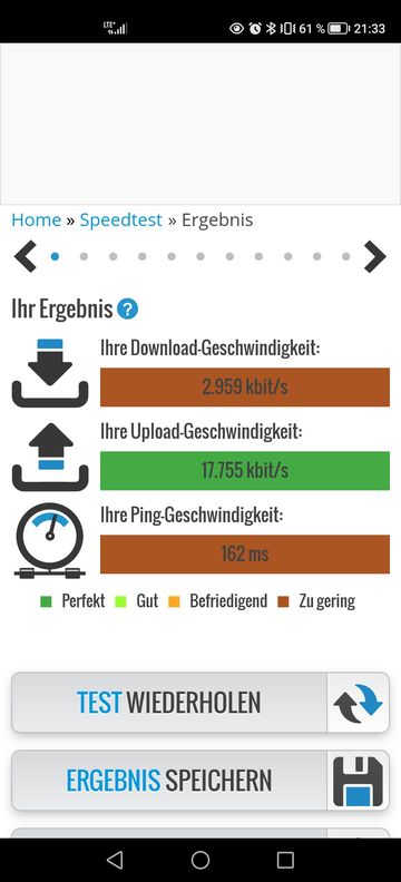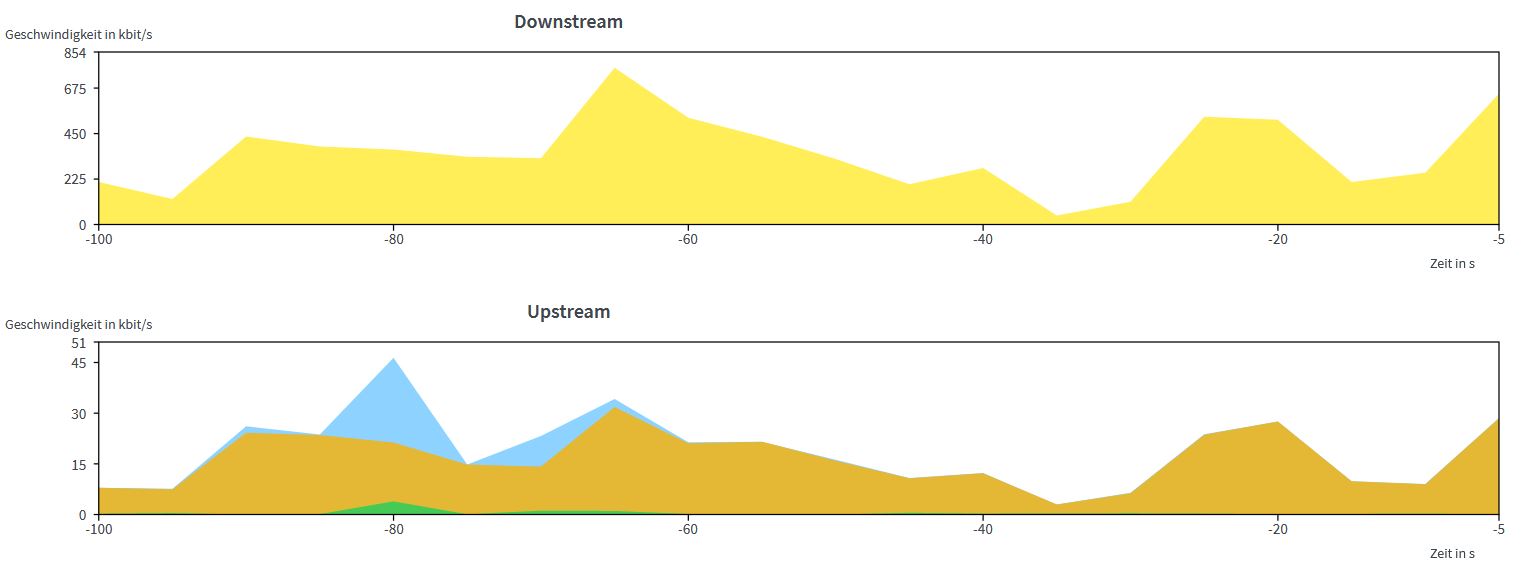 Mit der Congstar Simkarte maximal 0,58Mbit/s, eher weniger - siehe Auslastung. In der Regel pendelt es sich bei 100kbit/s ein. Upload auch nicht super, aber da ich kein Streamer bin - mir egal.