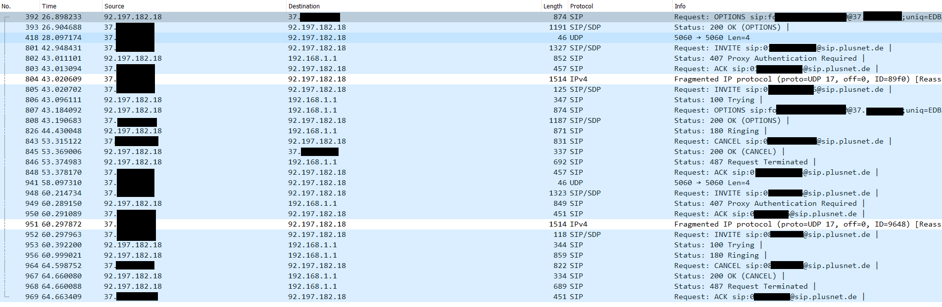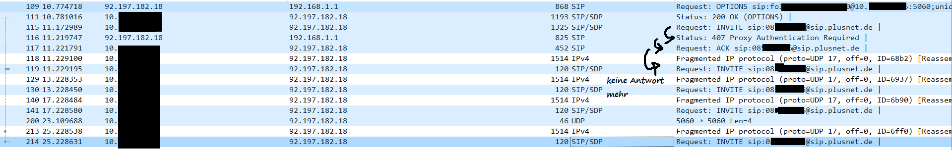 Bis jetzt (vor dem 01.07. ) funktionierte alles einwandfrei. Seit dem sind ausgehende Anrufe nicht mehr möglich. Es kommt kein Wählton und der Versuch bricht mit Gegenstelle besetzt ab. Laut Diagnose von Fonial kommt kein Invite mit Authentifizierung an. Laut Mitschnitt des Routers wird es gesendet. Auffällig ist, dass das wieder ein fragmentiertes Telegramm ist. Meiner Meinung nach wird das wieder irgendwo auf der Strecke "verschluckt".