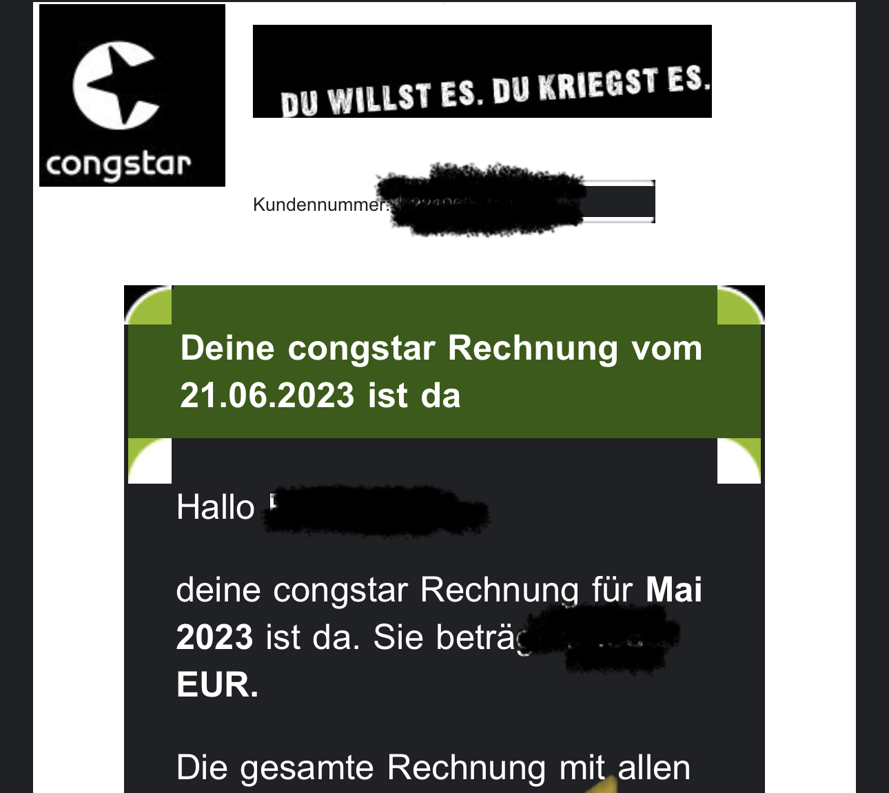Ich würde mir eine Plain-Text-Mail wünschen die wirklich nur den Hinweis auf die Rechnung und noch den Rechnungsbetrag nennt. Alles andere ist nicht wirklich notwendig.