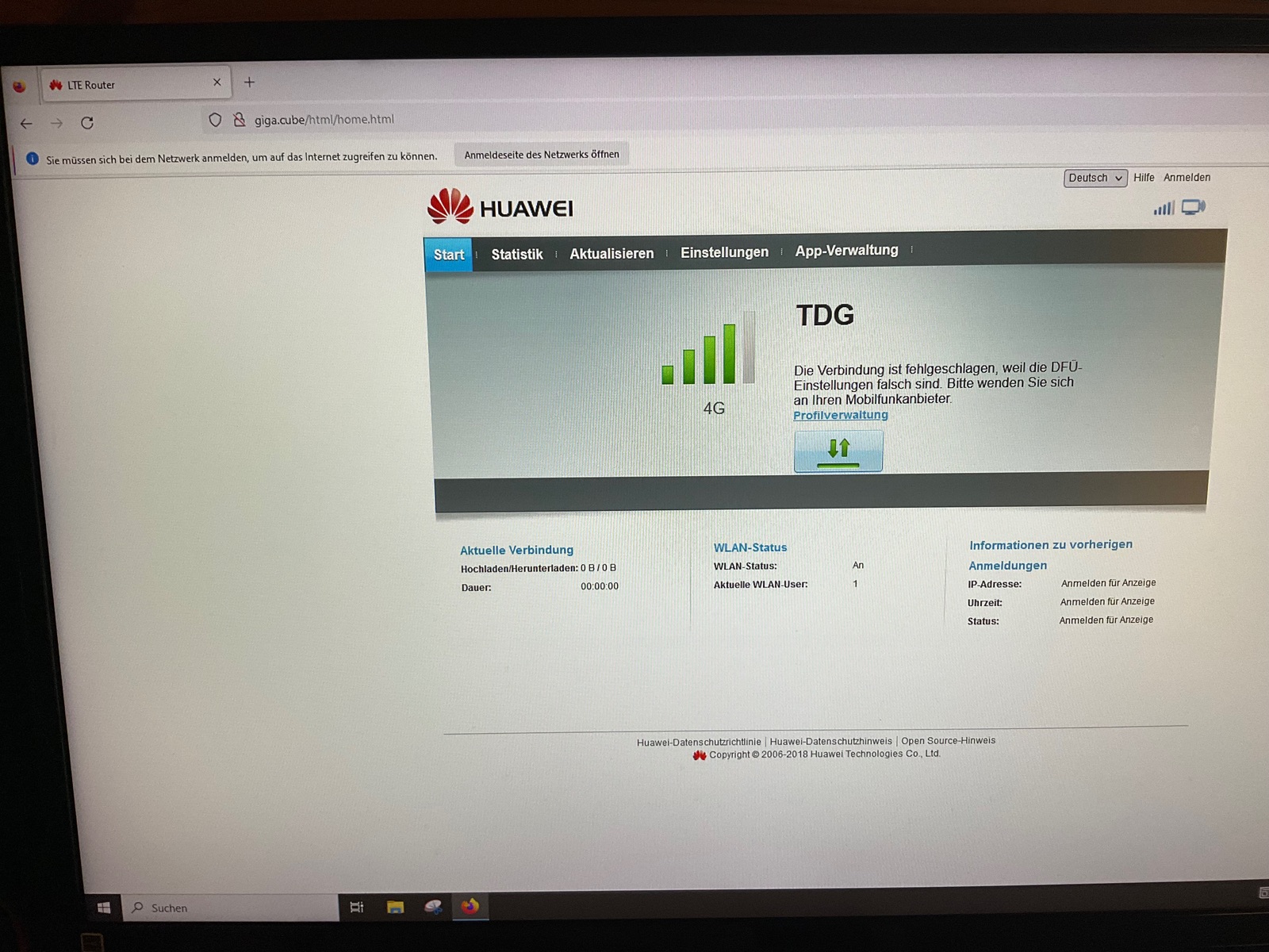 Alle meine Geräte erkennen zwar den GigaCube, ich habe auch volle Balken mit dem Hinweis „kein Internet, gesichert“. Es scheint eine Verbindung zu geben, auch per Ethernet, aber weiter komme ich nicht.