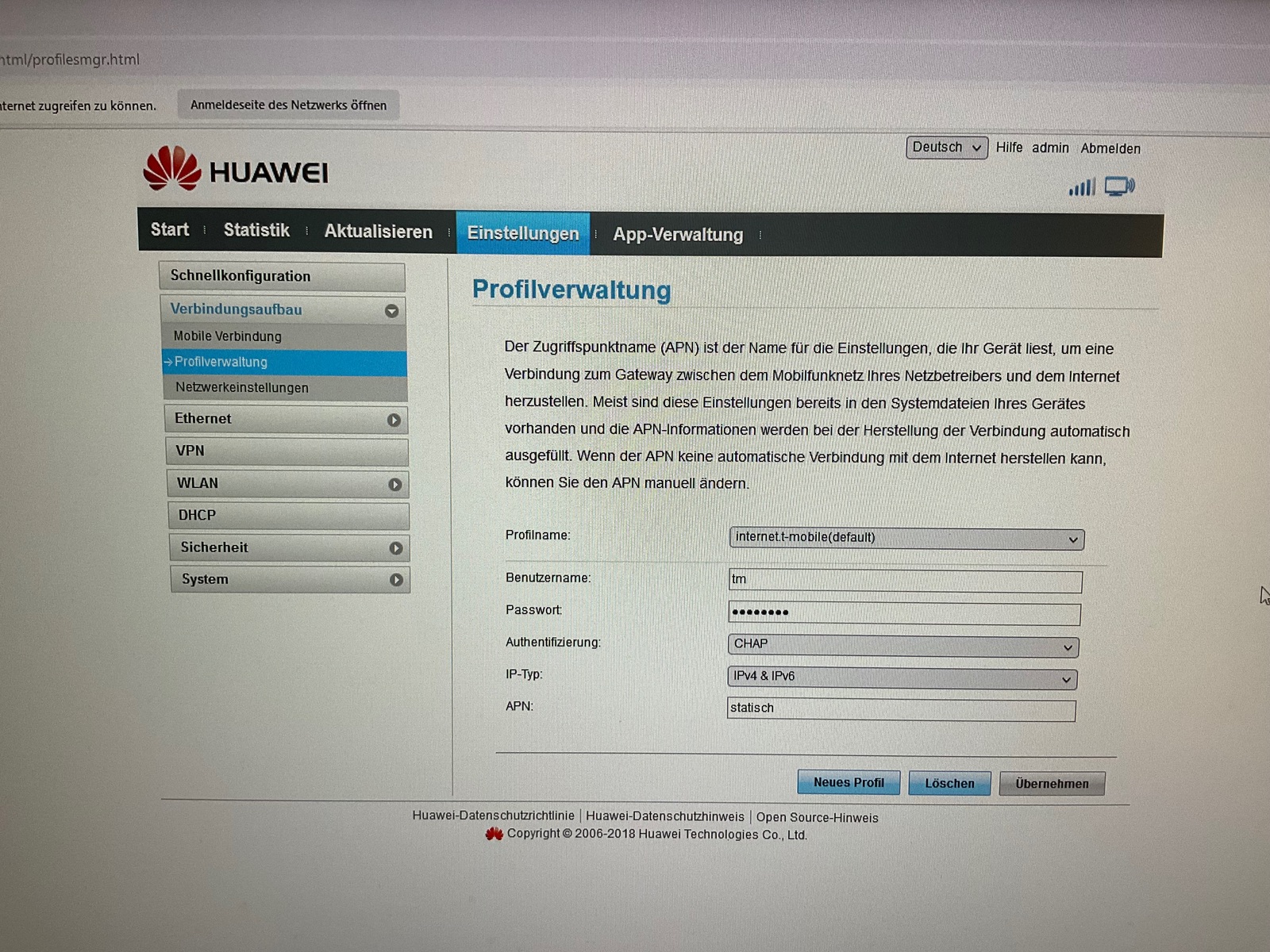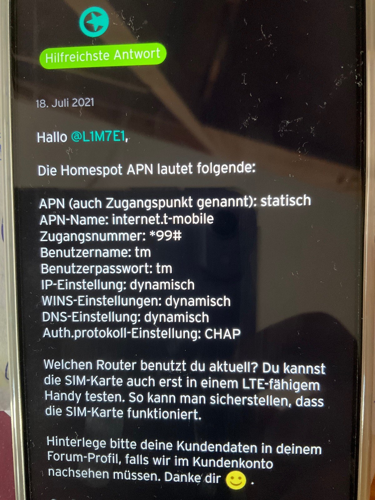 • An alle Helfer - der Tipp, den APN Namen einzutragen (zu ändern) und in den Netzwerkeinstellungen von automatisch auf 4G umzustellen, scheint wohl die letztliche Lösung (gewesen) zu sein. Zudem habe ich den IP-Typ von IPv4&IPv6 auf nur IPv4 umgestellt (ist ja auch nur ein LTE Homespot). Bis jetzt läuft es - vielen DANK!! 👌