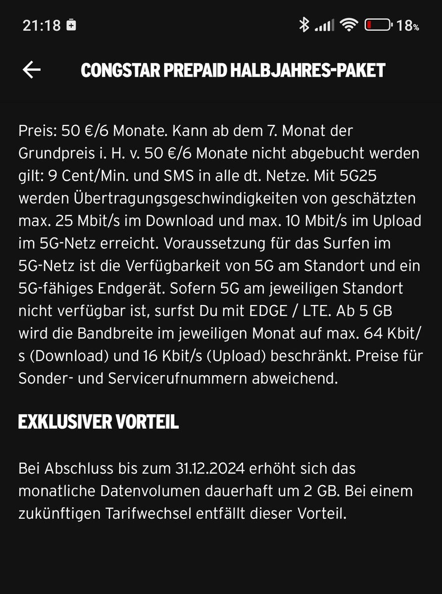 Zum einen sehe ich auch die obige Werbung, dass das Halbjahrespaket mit 5G beworben wird; andererseits heißt es im Kleingedruckten: