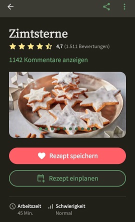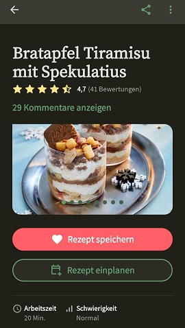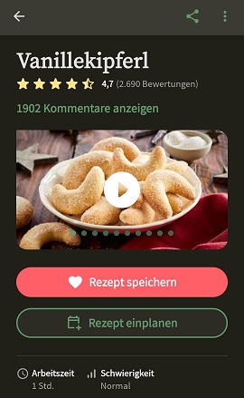 Wie ihr seht, ist es durchaus möglich, dass einem nicht nur Fotos, sondern auch Videos zu den Rezepten angezeigt werden. Hier habt ihr auch die Möglichkeit, das Gericht für euer Kochbuch zu herzen, zu teilen (außerhalb der App) und zu den Bewertungen zu springen. Ihr seht auch direkt wie viel Zeit das Rezept voraussichtlich in Anspruch nehmen wird und den geschätzten Schwierigkeitsgrad: