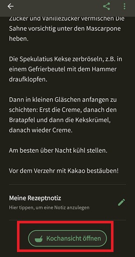 Wenn ihr die Kochansicht geöffnet habt, wird die Zutatenliste geöffnet und direkt darunter die Anleitung: