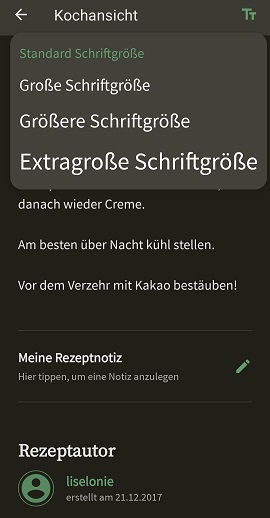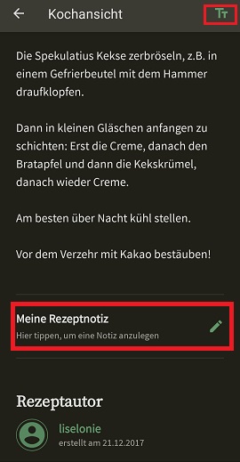 Wie euch vorhin vielleicht schon aufgefallen ist, könnt ihr euch auch Notizen zum Rezept machen. Für die Maulwürf*innen unter uns, kann man auch die Schriftgröße am oberen Rand einstellen: