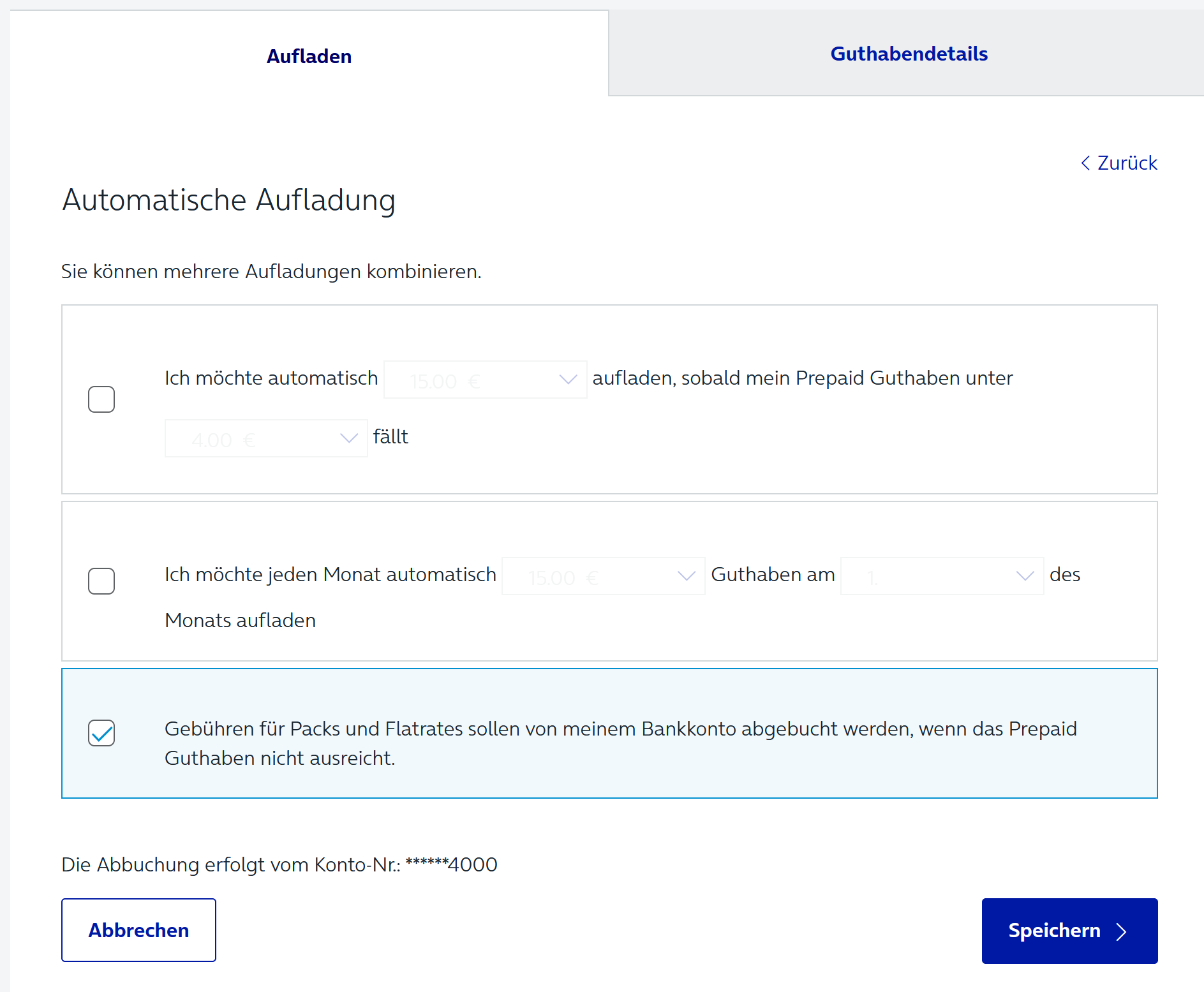 Bevor ich vor Kurzem zu euch gewechselt bin, hatte ich O2-Prepaid. Dort konnte man einstellen, dass, wenn eine neue Tarifzahlung ansteht und das Guthaben nicht ausreicht, genau der Fehlbetrag vom Konto aufgeladen wird. Ist das bei euch auch möglich? Oder wenigstens, dass genau der Tarifbetrag (in meinem Fall 10€ für Prepaid Allnet M) eingezogen wird?