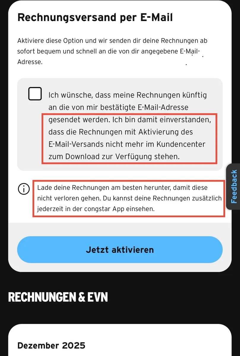 Hast du die Rechnungen per email Versand eingerichtet? Dann erscheinen sie nicht mehr im Browser. So steht es jedenfalls wenn man die Rechnungen per Email aktiviert dass man zustimmt das die Rechnungen nicht mehr im Kundencenter zum Download erscheinen auf der Seite wo mir die Rechnungen angezeigt werden. Ich habe den Versand per email nicht aktiviert.