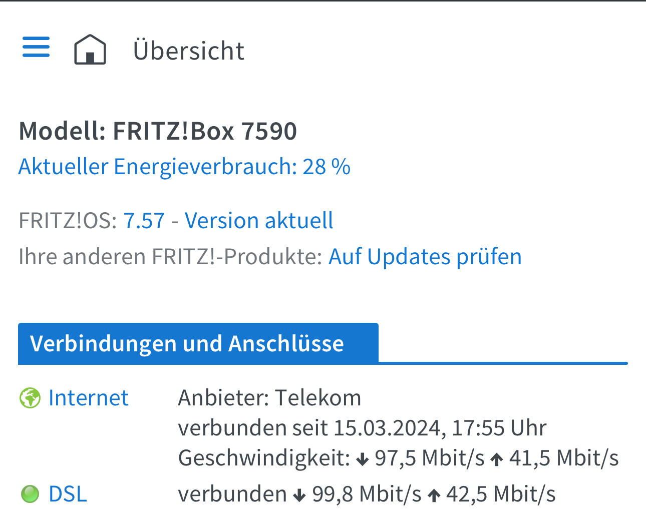 abgesehen von Deinem Problem solltest Du Deine Fritz!Box dringend updaten, wenn Du eine Verbindung hast. Für Deine 7590AX gibt es längst FRITZ!OS 7.80.