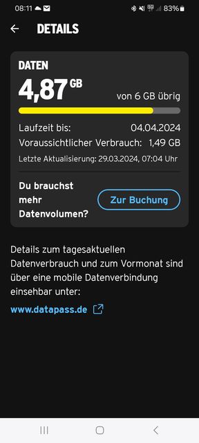 evanoni hast du die aktuelle App Version. Im Zweifel einmal die App deinstallieren und dann neu installieren. Alternativ auch mal den Cache lerren vielleicht hat da sich was aufgehängt. Alternativ kannst du über datapass.de auch den Datenverbrauch einsehen.