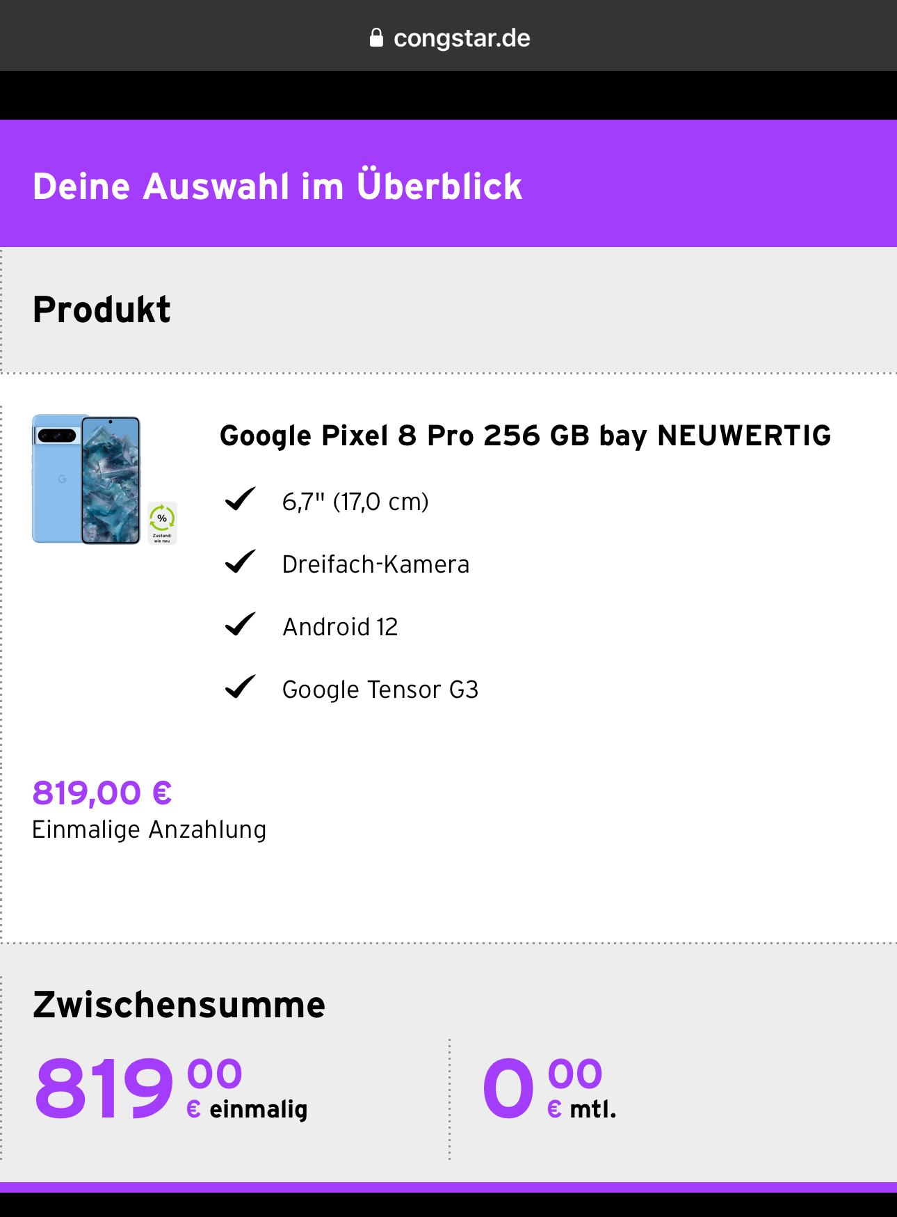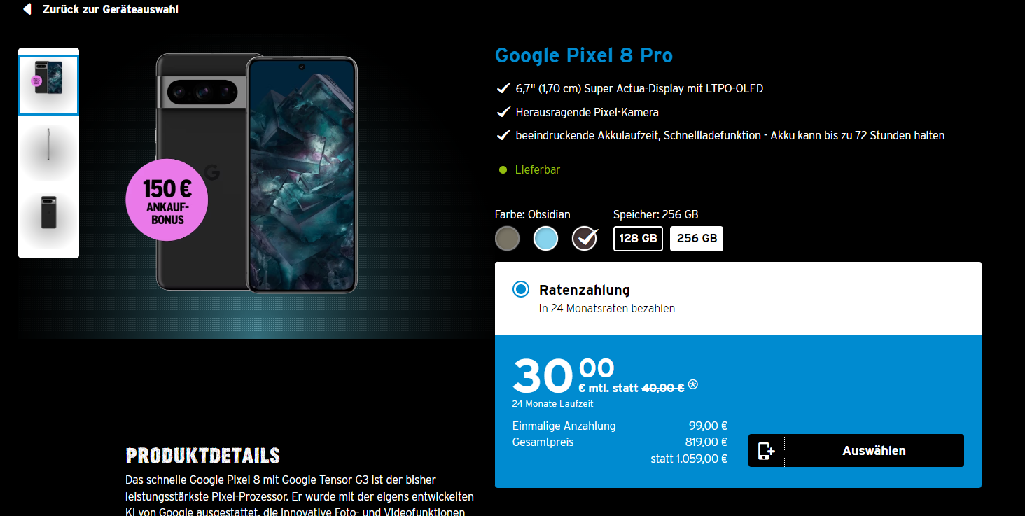 Mein aktueller Tarif ist ansonsten aber auch sehr gut. Ich muss diesen nicht zwangsläufig wechseln. Somit bleibt nur die Frage, warum beim Pixel Pro 8 256 GB keine Einmalzahlung möglich ist.