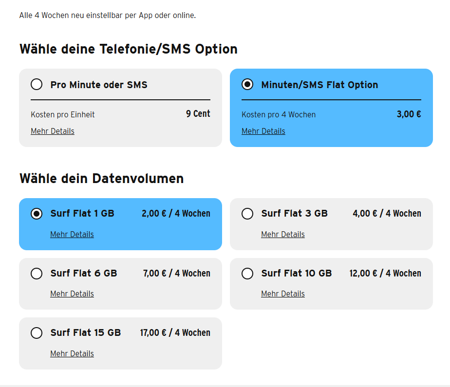 Braucht man doch mal z.B. im Urlaub mobile Daten dann sind sie Optionen eigentlich unverschämt, weil noch auf dem alten Stand. 100 MB für 2 €, 400 MB für 4€ und 1000 MB für 8€.