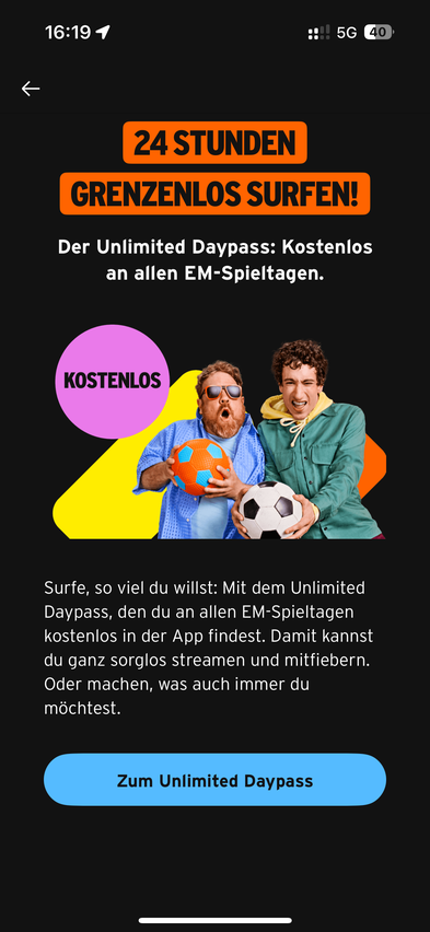 Außerdem zeigt ein neues Banner in der App das es an allen EM Spieltagen einen kostenlosen Daypass geben wird. 👍🏼