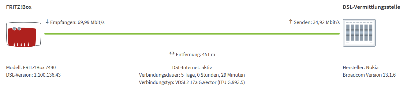 Die Fritzbox meldet eine angebliche Leitungslänge von 237 m. Das ist auch plausibel, zum DSLAM-Kasten sind es 150 m Fußweg.