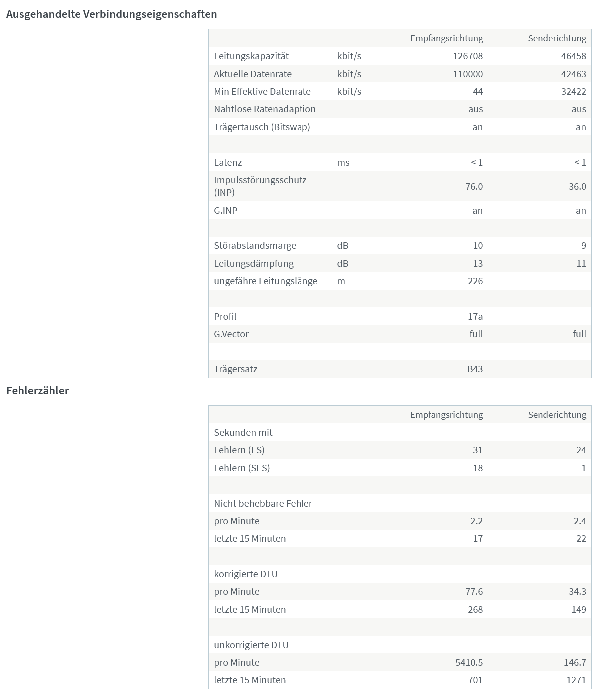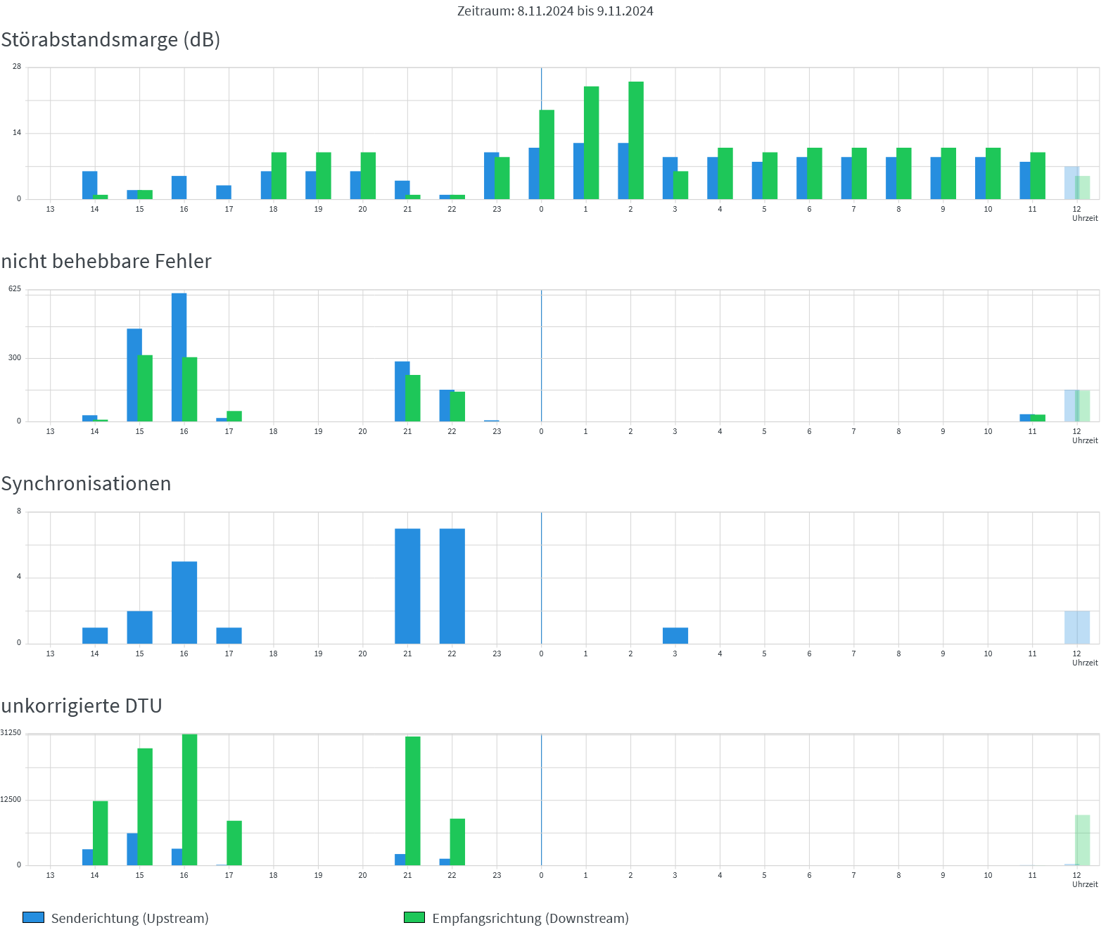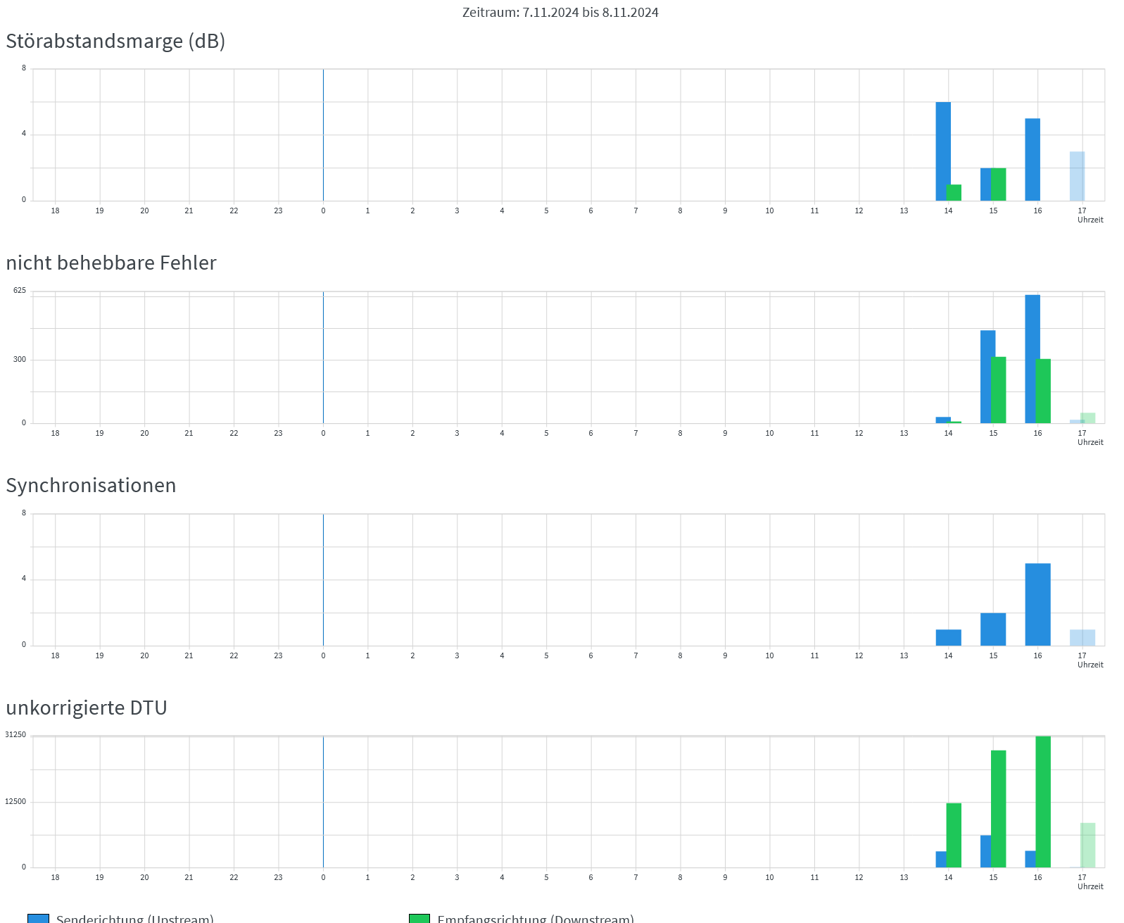 Neustart des Routers hat leider die vorige Statistik gelöscht (sah aber ähnlich aus seit gestern Mittag, davor stabile, wenn auch nicht hohe, Störabstandsmarge ohne Resyncs)