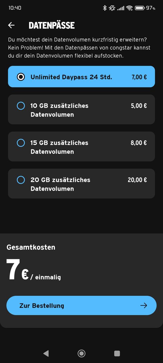Die Darstellung in der Android-App zur Buchung vorübergehender Datenpässe finde ich etwas unglücklich.