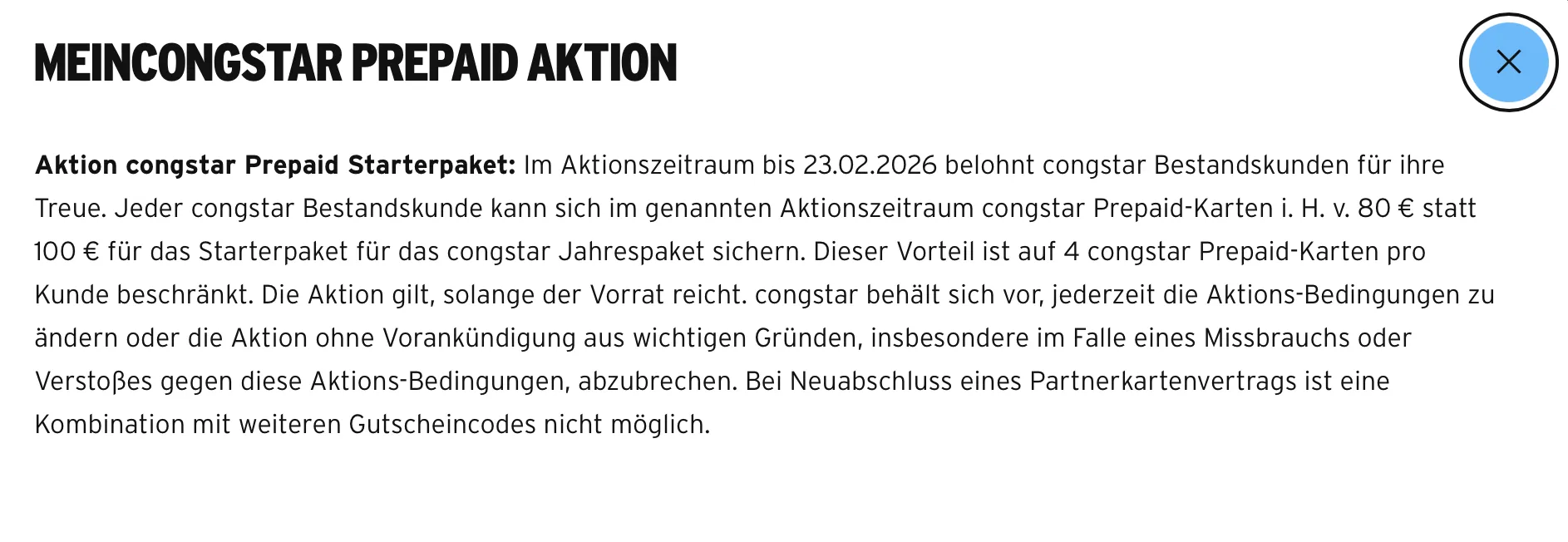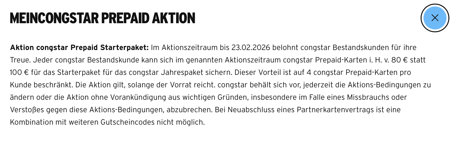 wo hast du denn dieses Angebot aufgegriffen? Das einzige was ich dazu finden konnte war folgendes Angebot, das sich allerdings an Bestandskunden richtet, sofern man weitere Prepaid-Karten erwerben möchte: AKTION Starterpaket nur 80 € statt 100 €