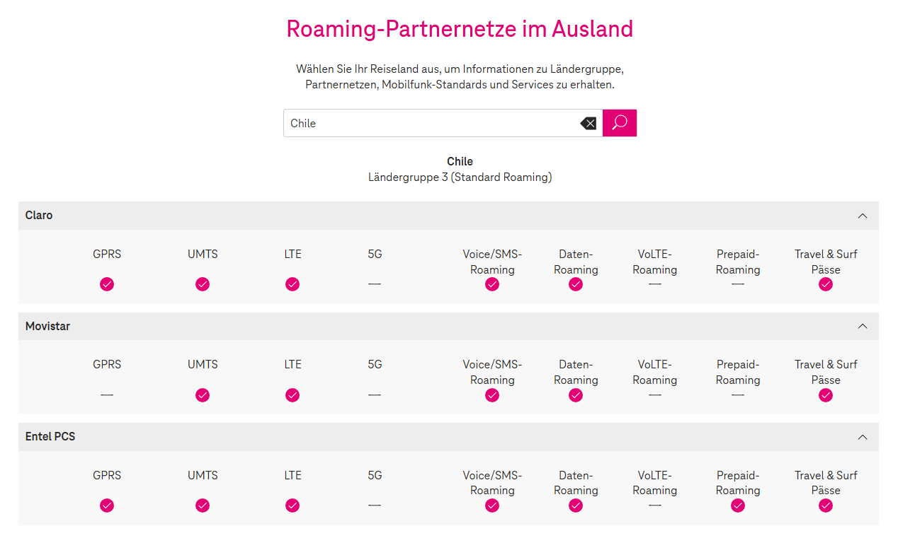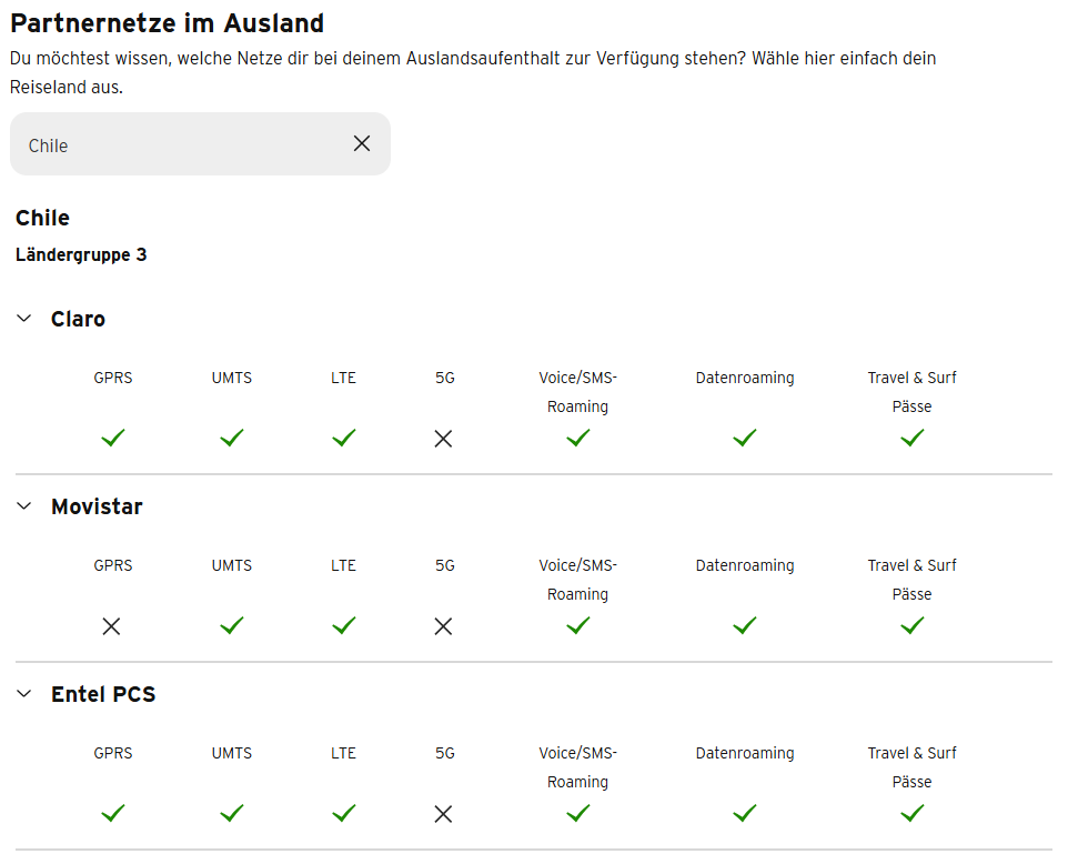 Wäre es möglich, auf dieser Seite bei "Partnernetze im Ausland", nach der Eingabe eines entsprechenden Landes, auch die Rubriken "VoLTE-Roaming" und "Prepaid-Roaming" anzuzeigen?