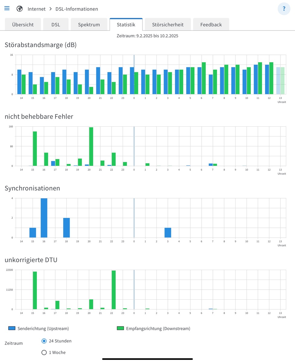 Der Anschluss funktionierte nach Anbieterwechsel zu congstar für wenige Tage problemlos mit voller vertraglicher Bandbreite, seit ca. 1 Woche kommt es jedoch zu vermehrten Störungen (massiv am 9.2. zwischen ca. 12:00 und 20:00 Uhr) bei nunmehr offenbar dauerhaft gedrosselter Geschwindigkeit.
