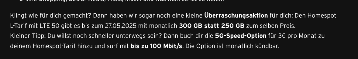 ich hatte vor ein paar Tagen gemerkt das der Homesport L bei 350 GB ist und mich 30 € pro Monat kosten würde. Als ich mir dem Tarif heute nochmal angeschaut habe hab ich festgestellt das der Tarif auf einmal nur 300 GB und 40 € kostet. War das nur ein Angebot für kurze Zeit? Da ich aktuell ernsthaft überlege auf diesen Tarif zu wechseln.
