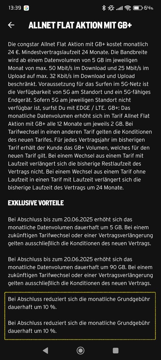 Bei Tarifwechsel (hier im Screenshot beispielhaft der Aktions-Tarif) wird mir im Sternchentext zum Gesamtpreis ganz unten 2x 10% Rabatt angezeigt.