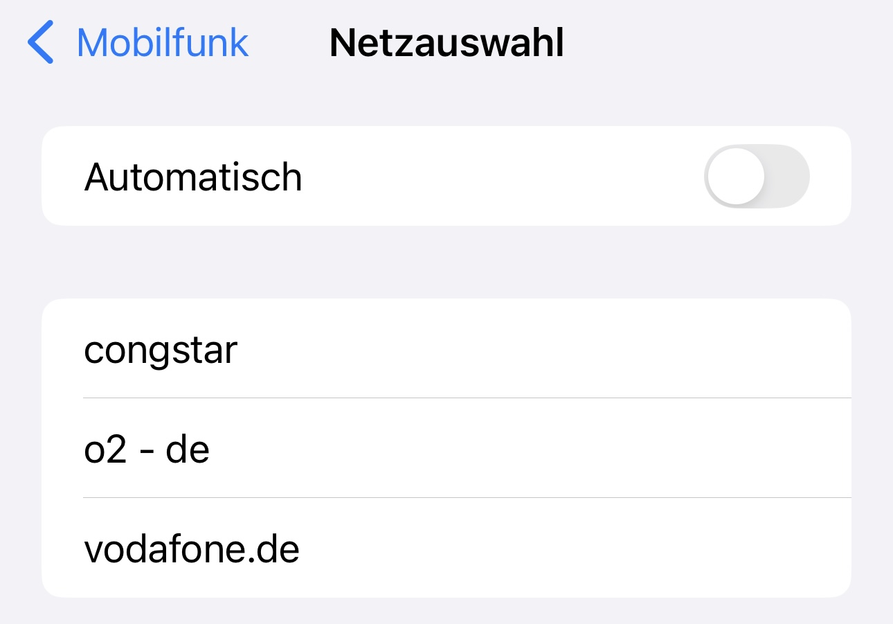 Das ist die manuelle Netzwahl auf dem iPhone mit verfĂŒgbaren Netzwerken.