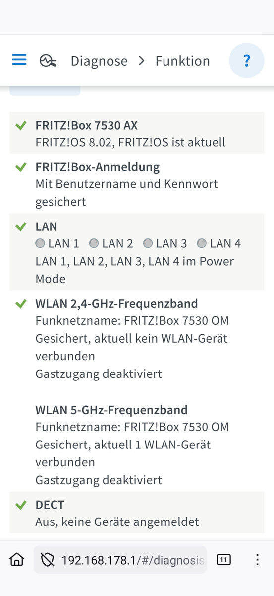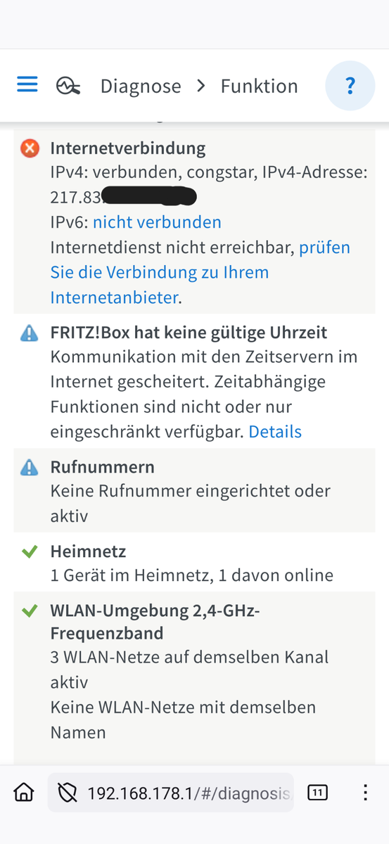 Siehe Screenshot von der Fehleranalyse der Fritzbox. "Internetdienst nicht erreichbar". Die zum Teil geschwärzte ipv4 Adresse kann ich auf Anfrage zusenden sowie die örtliche Anschluss-ID mit Vorwahl. (Im Übrigen werde ich auf eine Info-Ansicht mit meiner örtlichen Anschluss ID weitergeleitet, wenn ich bei der Fehlermeldung im Screenshot auf den blau hinterlegten Link "prüfen Sie die Verbindung zu Ihrem Internetanbieter" klicke.)