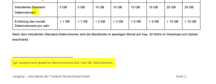 - Im Interface/Sternchentext stehen meist deutlich niedrigere Werte: Die Bandbreite wird ab einem Datenvolumen von 15 GB im jeweiligen Monat von max. 50 Mbit/s im Download und 25 Mbit/s im Upload auf max. 32 Kbit/s im Download und Upload beschränkt.