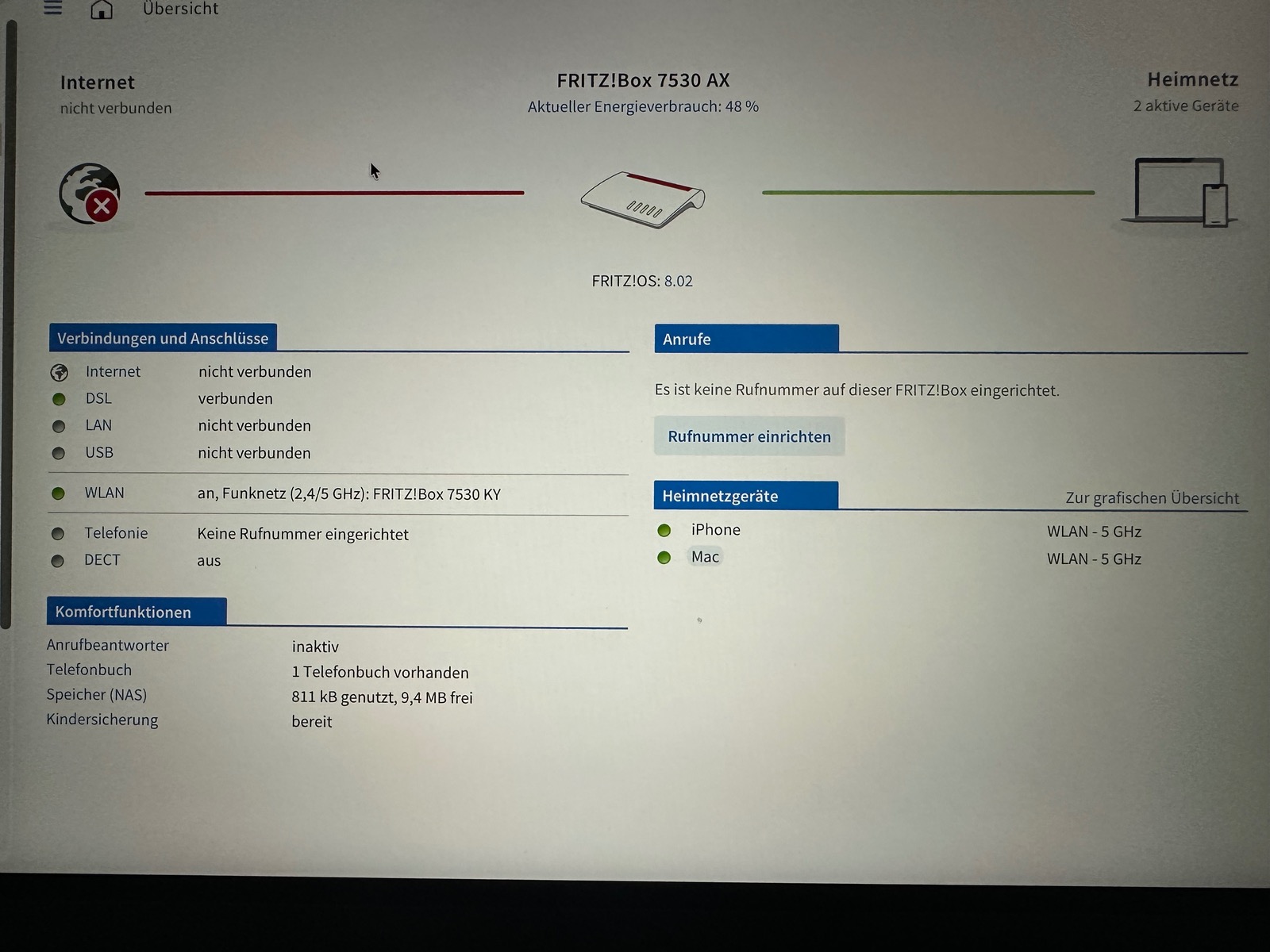 Die Grafik bei der DSL Übersicht im Routermenü zeigt einen roten Balken von „außen“ zum Router und einen grünen Balken vom Router zu meinen angemeldeten Geräten. Nützt aber ja nichts.