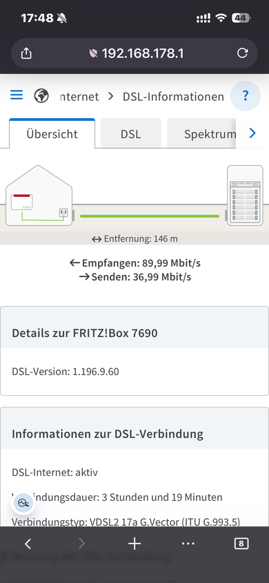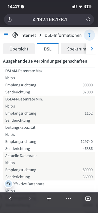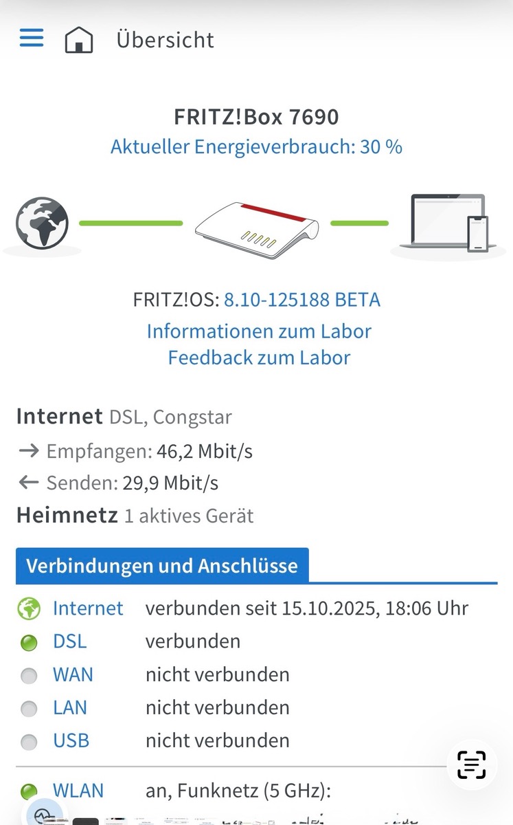 Habe hier seit geraumerer Zeit nun bereits nur noch 87,9 von sonst anliegenden 109,3 Mbit und 36 von 41,4 Mbit. Nutze ja Labor Versionen bei meiner FRITZ!Box 7690 und habe deswegen auch schon den Fritz! Support angeschrieben. Den dortigen Anregungen Folge geleistet aber keine Veränderung. Bin mit der Box auf der aktuellsten Labor OS Version.