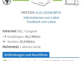 Habe hier seit geraumerer Zeit nun bereits nur noch 87,9 von sonst anliegenden 109,3 Mbit und 36 von 41,4 Mbit. Nutze ja Labor Versionen bei meiner FRITZ!Box 7690 und habe deswegen auch schon den Fritz! Support angeschrieben. Den dortigen Anregungen Folge geleistet aber keine Veränderung. Bin mit der Box auf der aktuellsten Labor OS Version.
