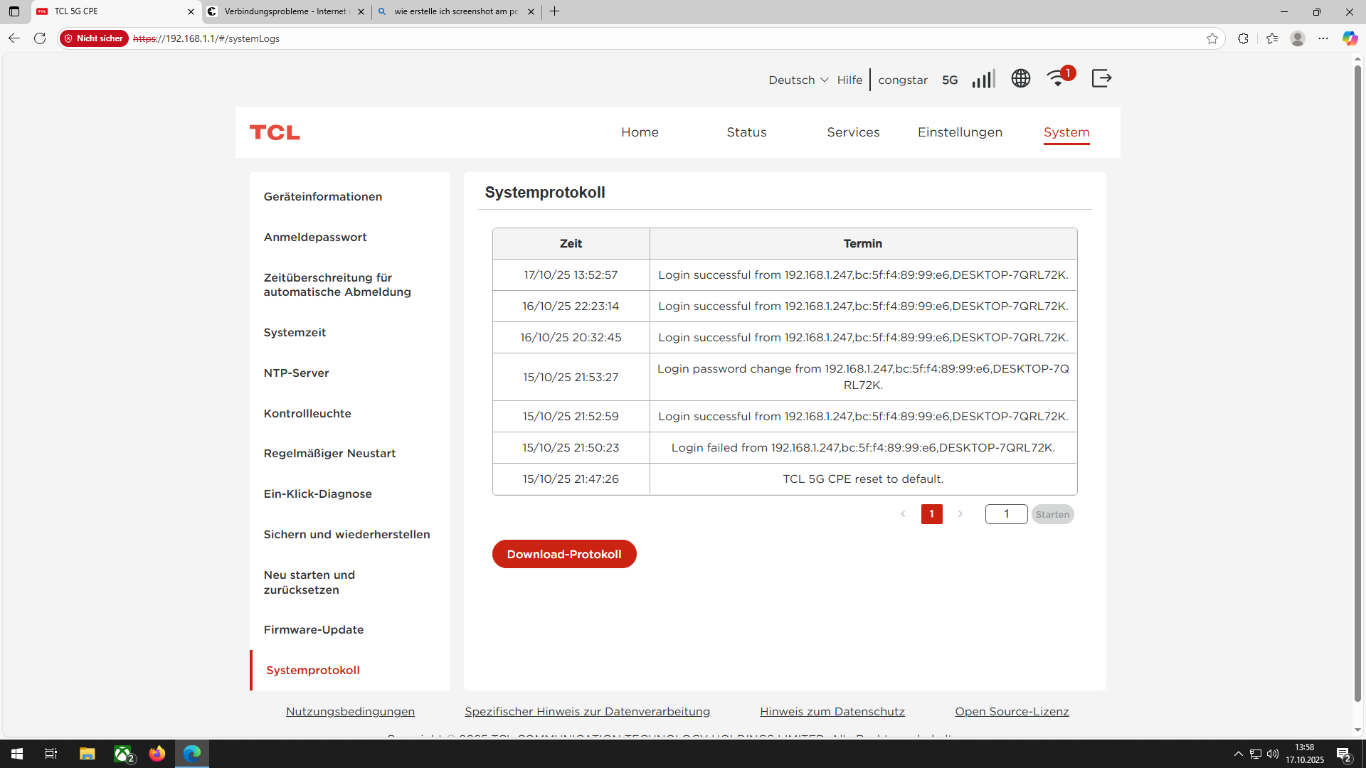 So Firmware ist auf dem neuesten Stand, falls du mit log das Systemprotokoll meinst, kommt hier der Screenshot dazu. Firefox Screenshot ist auch beigefügt. Tina Ich benutze den Homespot da wo ich aktuell auch wohne, kein anderer Standort.
