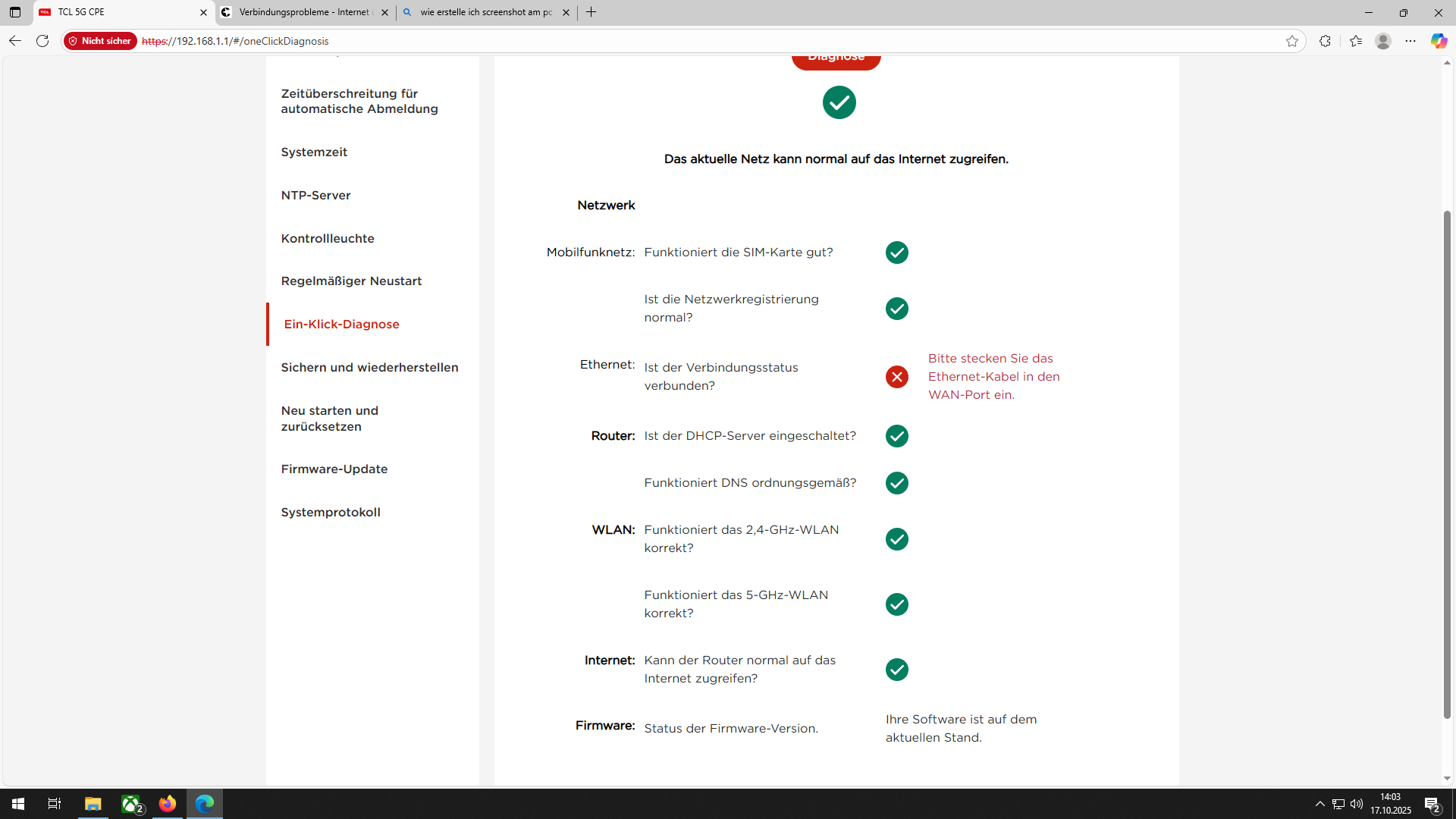 Habe etwas herausgefunden. Die Ein-Klick-Diagnose sagt folgendes: Das Kabel ist natürlich normal drin im WAN - Port.