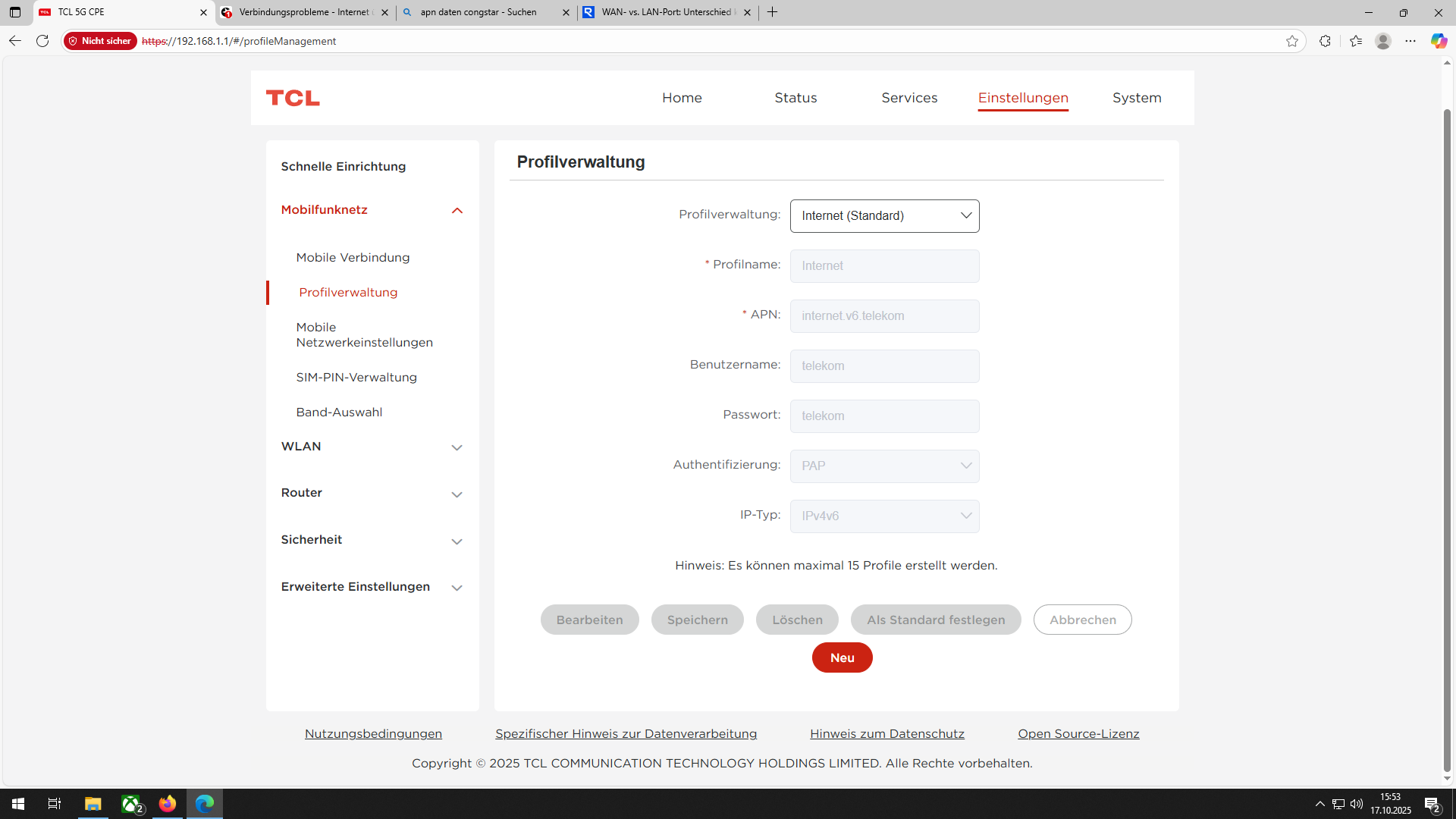 SIM-Karte aktiv aus Freefunk hat nicht funktioniert 2 blaue Balken bei Power und WiFi aber kein Netz. APN umgestellt, wird jetzt getestet, Router-Overlay nach wie vor nur über Microsoft-Edge zu erreichen, bzw. das Einloggen funktioniert nur dort, auf Firefox passiert einfach nichts nach Angabe des Router-Passworts.
