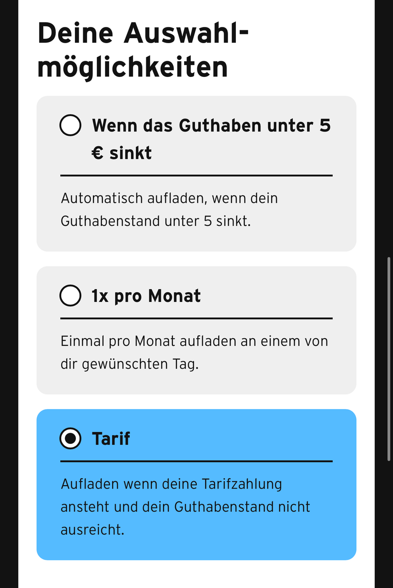 ist es möglich, per automatischer Aufladung mit Auswahlmöglichkeit "Tarif" einen anderen Betrag als die vorgegebenen auszuwählen? Mein Tarif kostet 10 € alle 4 Wochen, also würde ich auch immer gerne genau diese 10 € aufladen. Zur Auswahl stehen aber nur Beträge ab 15 €. Am sinnvollsten wäre es doch, wenn man den Betrag frei angegeben könnte. Noch besser wäre es, wenn man sich gar nicht um die Höhe des Betrags kümmern müsste und der aufzuladende Betrag automatisch anhand der Tarifdaten ermittelt wird.