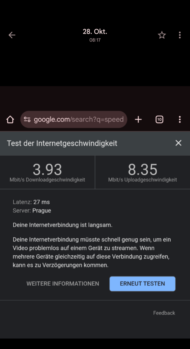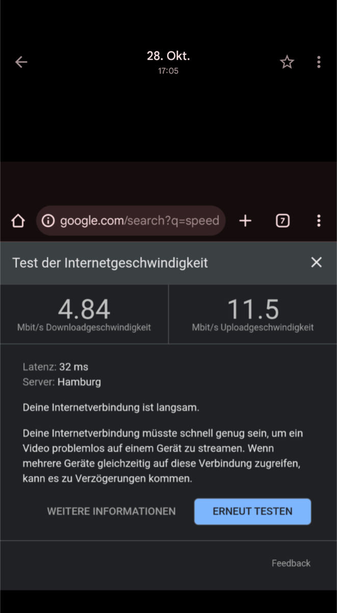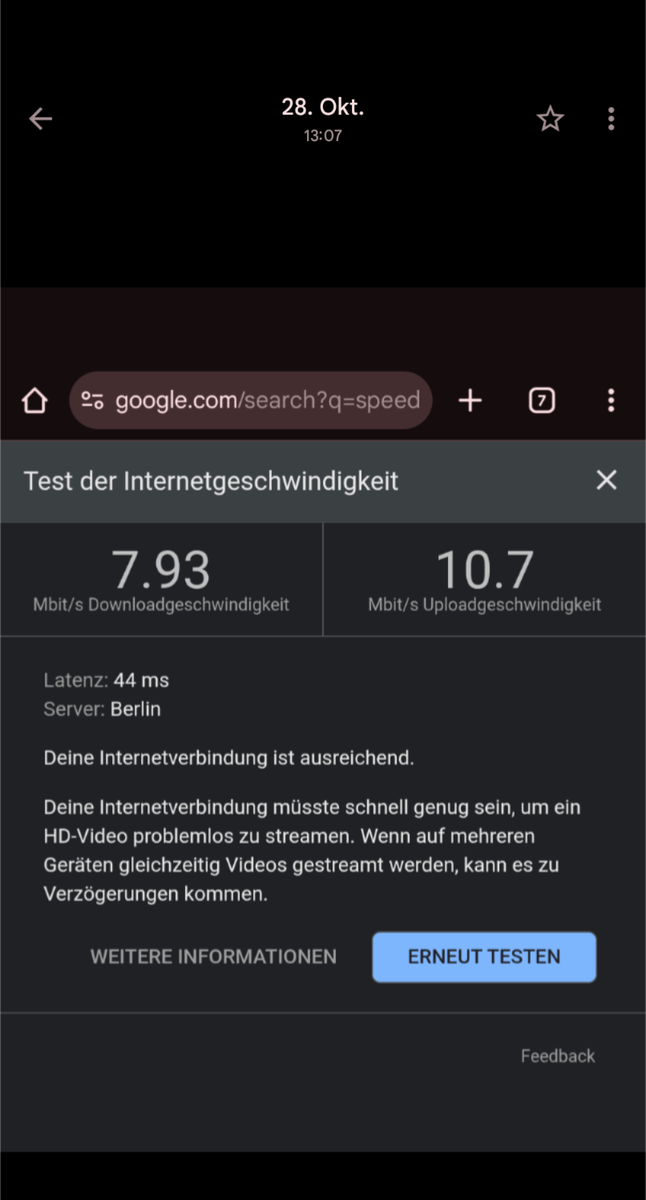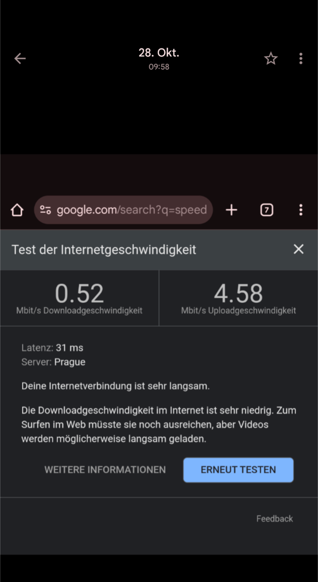 Eine Mail und zwei Anrufe beim Kundenservice halfen ebenso wenig. Beim letzten Anruf wurde mir gesagt, ich solle die SIM Karte in mein Telefon legen und dort den Empfang testen. Das hat komischerweise geklappt und ein Speedtest hat akzeptable Ergebnisse geliefert.