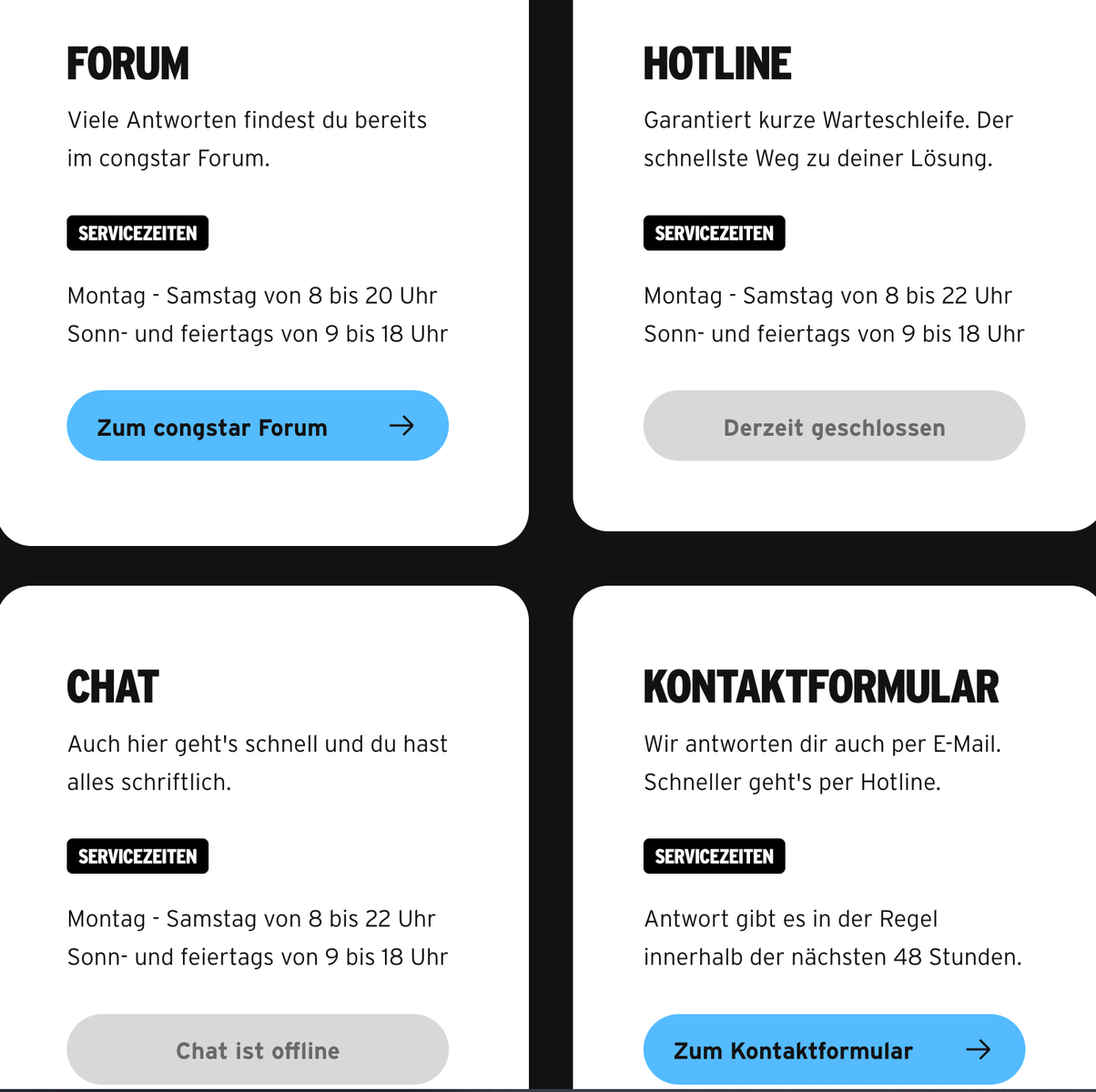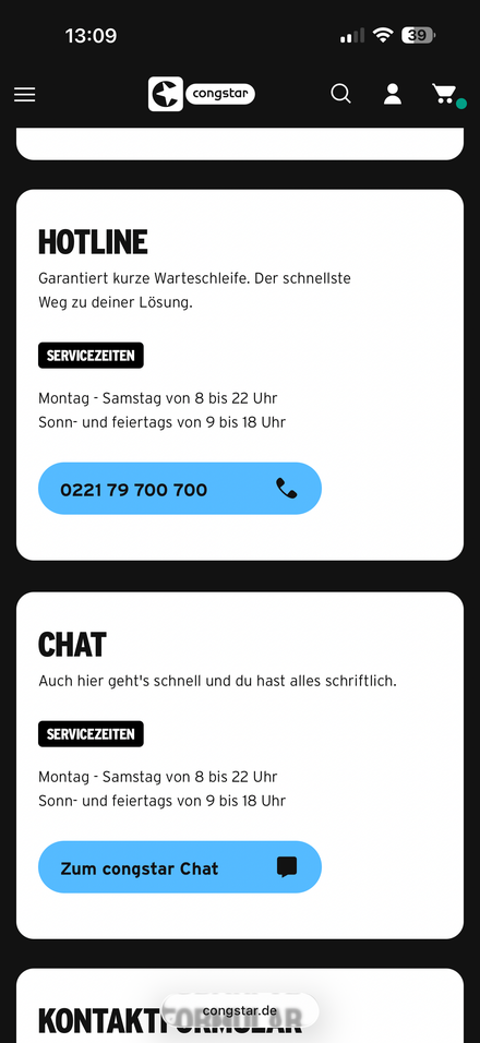 Wenn ich in der App klicke passiert gar nichts und wenn ich die Seite im Browser öffne, wird mir Hotline und Chat als geschlossen angezeigt.