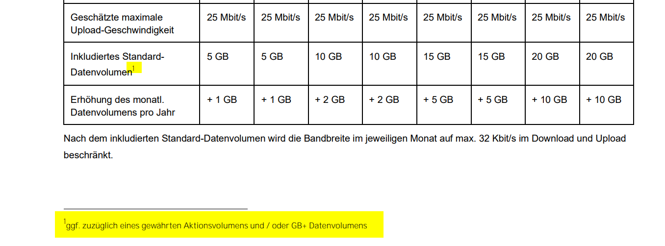 Für ALLNET FLAT S mit GB+ wird mir 54GB angezeigt. Wenn ich das zugehörige Produktinformationsblatt runter lade, steht dann 'Ab Verbrauch von 25 GB Datenvolumen