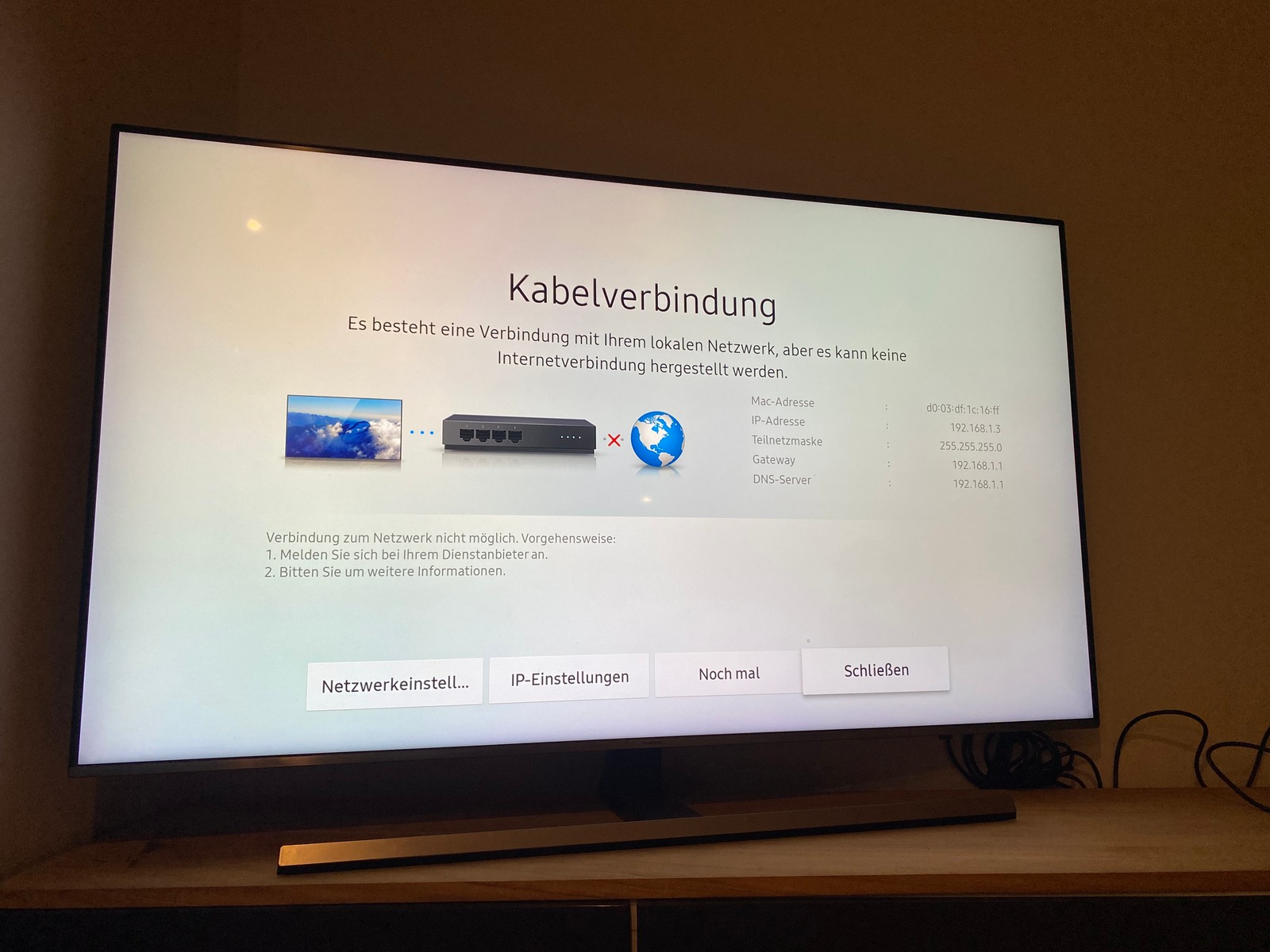 leider können wir unseren Homespot Tarif nicht über unseren Fernseher nutzen, da unabhängig davon, ob wir den Fernseher über LAN oder WLAN mit unserem Router (TP Link Archer NX200) verbinden, folgende Fehlermeldung angezeigt wird: