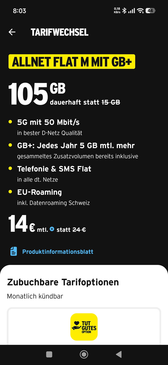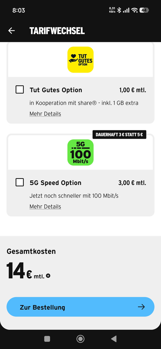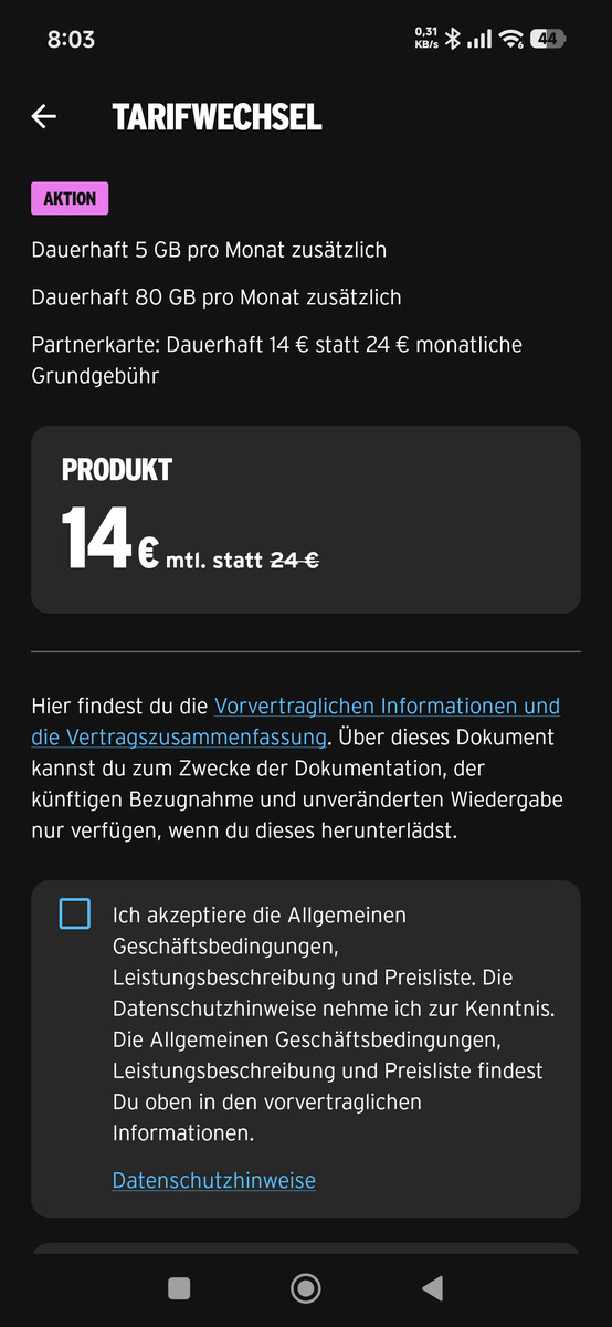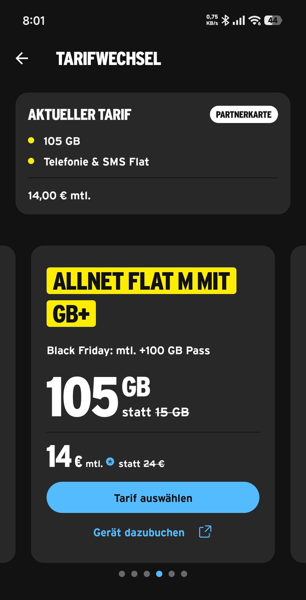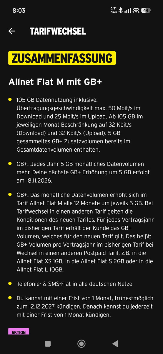 Habe drei Monatsverträge, davon sind zwei jeweils eine Partnerkarte. Wollte nun die beiden Partnerkarten an meinen Hauptvertrag angleichen und in der App das BlackFriday- Angebot auswählen. Bisher blieb immer die monatliche Vertragslaufzeit bestehen, jetzt wird daraus aber automatisch ein Zweijahresvertrag, habs das nur entdeckt weil ich mir das Produktinformationsblatt angeschaut habe! Was soll denn das?!? Außerdem ist vom BlackFriday-Bonus überhaupt nichts zu finden in all den Vertragsinfos bei der Auswahl!