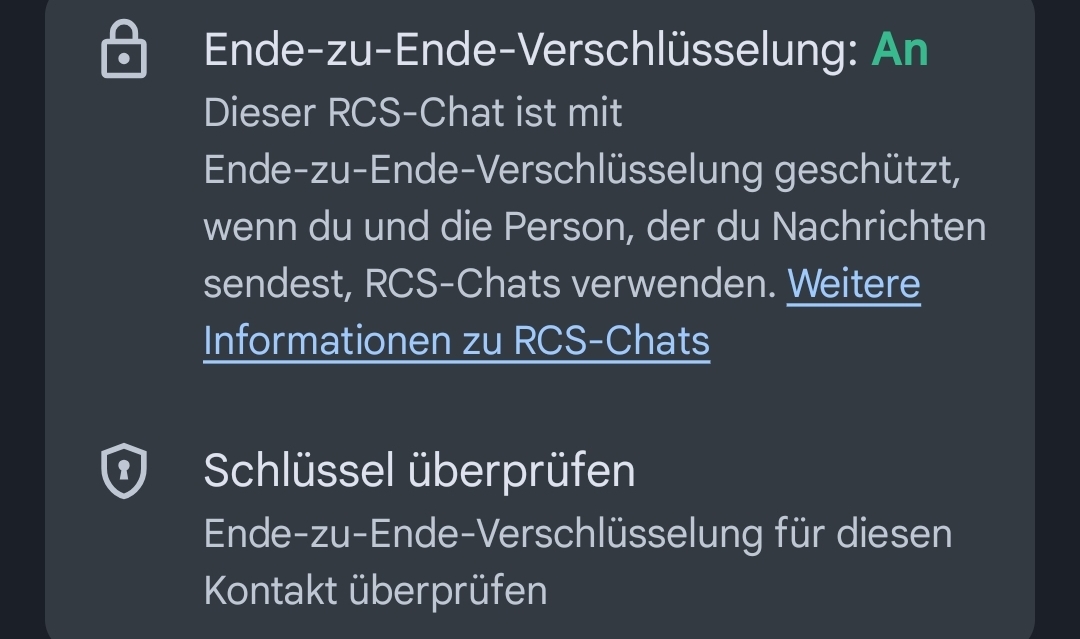 Entscheidend ist halt, dass die Mobilfunkanbieter dann mindestens RCS 3.0 implementiert haben. Bis dahin gibt es zwar eine Transportverschlüsselung (damit sie nicht unterwegs abgefangen werden können) aber eben nicht die serverseitige, die es auch den Mobilfunkanbietern (und somit je nach Land auch staatliche Institutionen) ermöglicht, die Kommunikation im Klartext mitzuverfolgen.