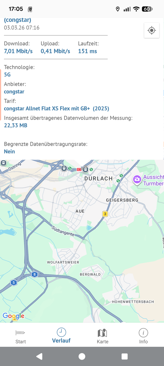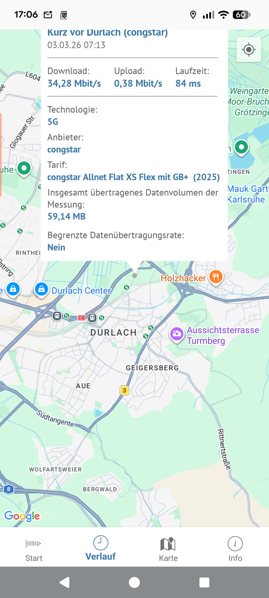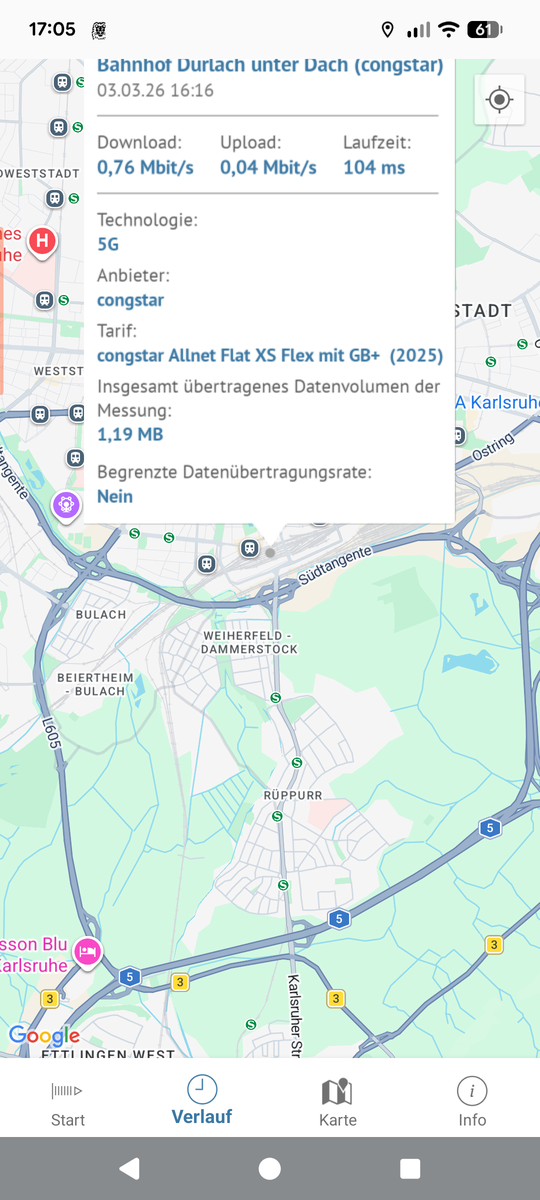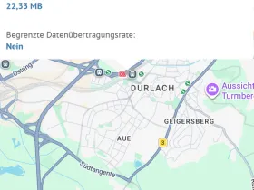 bei meiner Zugfahrt von Karlsruhe Hbf nach Bruchsal muss ich im Bahnhof Durlach leider immer wieder feststellen, dass der Empfang dort total schlecht ist. Mit etwas Glück habe ich einen Balken, aber kaum Durchsatz (einfache Seiten brauchen eine Minute zum Laden) oder das Netz ist ganz weg. Erst wenn man ein ganzes Stück auf den Bahnhof raus ist, kehrt der Empfang zurück.