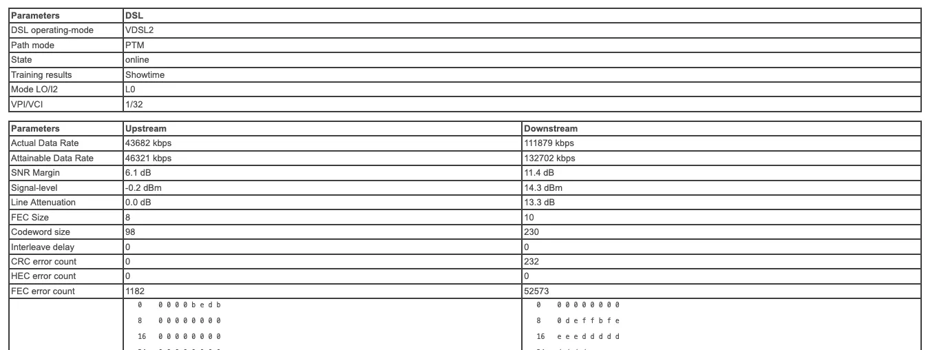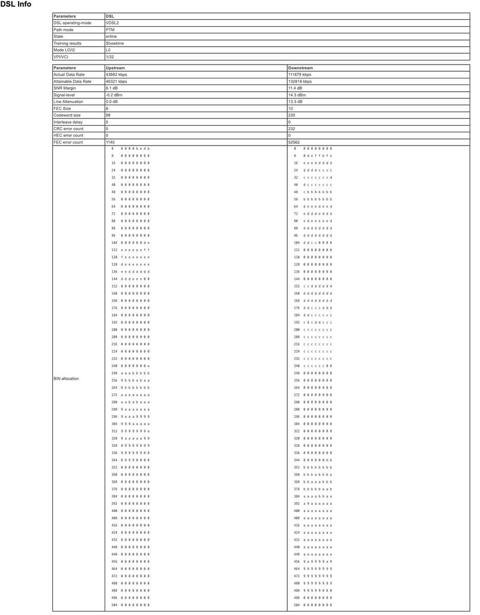 Mein Anschluss (aktuell 111 Mbit/s Down / 43 Mbit/s Up) läuft damit völlig ohne physikalischen Puffer auf der absoluten Rasierklinge. Der DSLAM zwingt das Modem im Upstream permanent auf einen Target-SNR von extrem kritischen 6,0 bis 6,3 dB.