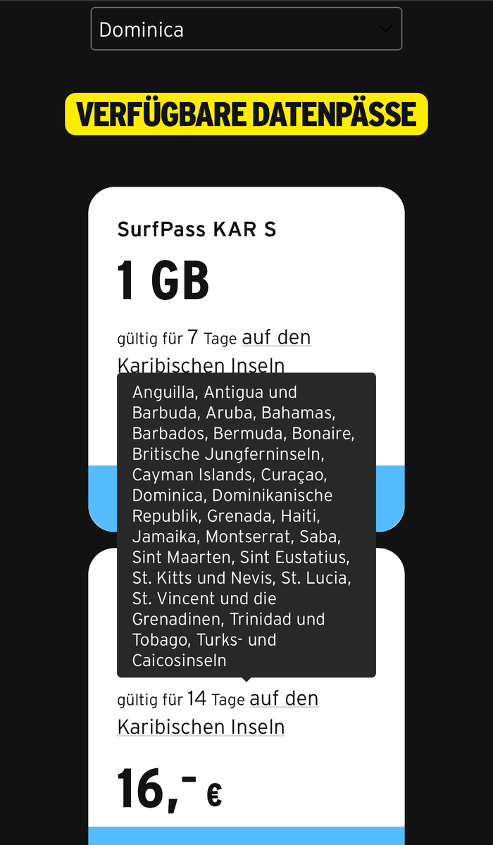Dominica hingegen ist ein unabhängiger Inselstaat mit eigener Währung und gesonderten Einreisebestimmungen. Hier greift Ländergruppe 3, also entsprechend auch kein EU-Roaming. Für den Aufenthalt dort macht es also Sinn einen Datenpass im Voraus zu reservieren. Der wird dann aktiv, sobald sich dein Handy dort das erste Mal mit dem Mobilfunknetz verbindet. Die Kosten zu den Pässen und alle weiteren Kosten (Telefonie/SMS etc.) findest du hier: Roaming in Dominica