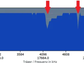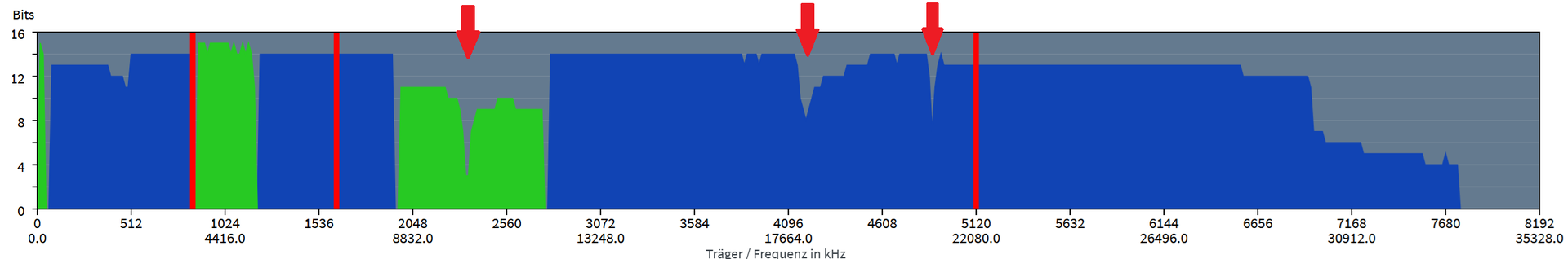 ich hatte heute im Laufe des Tages wegen einer DSL-Störung angerufen. Es wurde ein Techniker-Termin für Freitag geplant, aber ich habe Zweifel, dass das irgendwas in meinem Fall bringt, weil die Störung anscheinend durch einen Amateurfunker in der Nachbarschaft verursacht wird. Sobald der Amateurfunker am Wochenende aktiv wird, bricht bei mir an bestimmten Stellen im DSL-Spektrum die Verbindungsqualität ein, und es kommt sporadisch zu Verbindungsabbrüchen. (entsprechendes Bild mit roten Pfeilen angehängt)