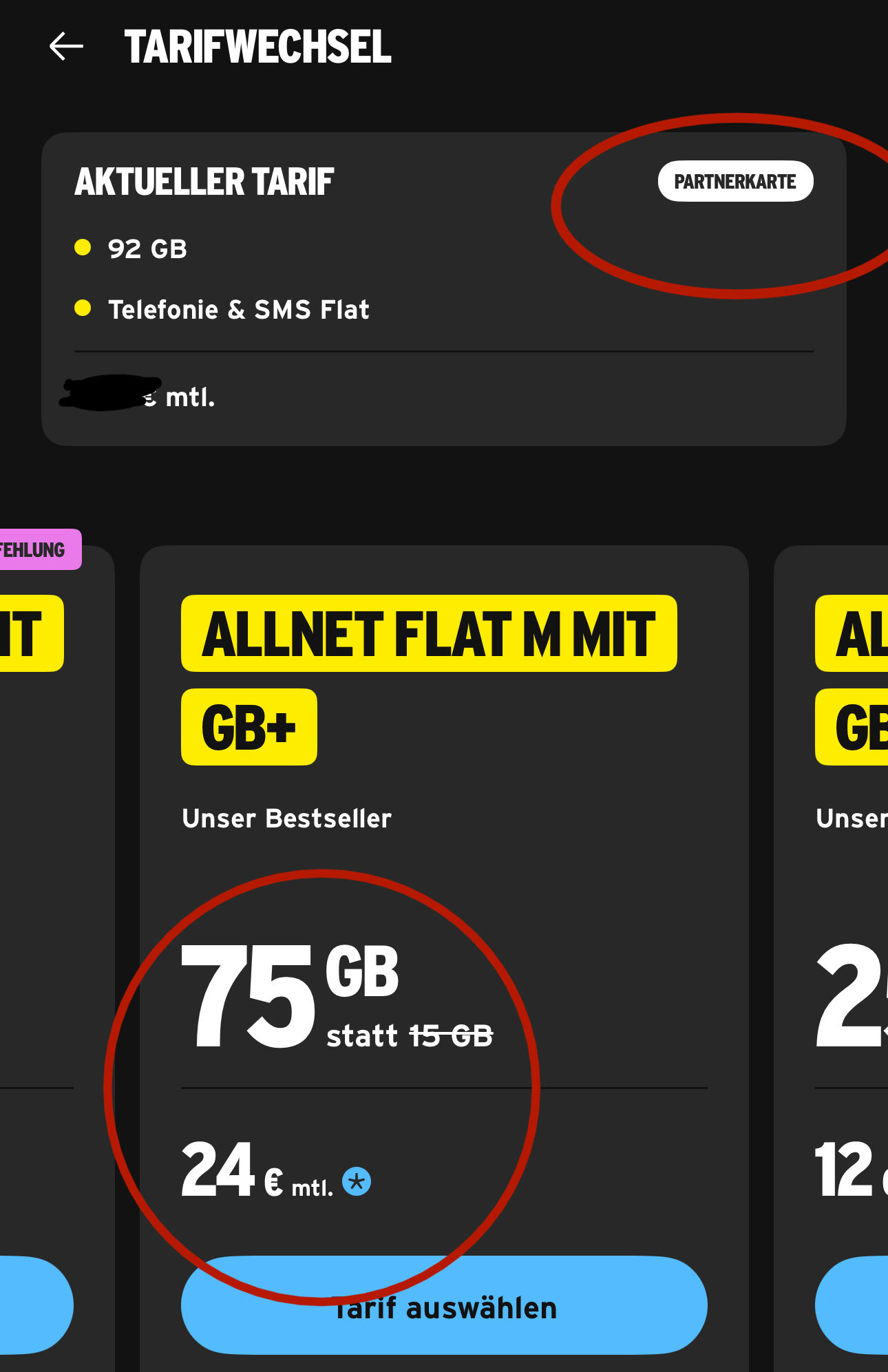 harob komisch meine Partnerkarte ist auch in der 24 Monatsbindung und hätte 14 € . Könnte es nicht sein das es mal eine Partnerkarte war aber jetzt eine Hauptkarte (es gab da ja letztes Jahr mal eine Umstellungsaktion wo weiter der alte Preis gilt). Steht da wirklich bei der Rufnummer bzw. in den Tarifangaben der Zusatz "Partnerkarte"?