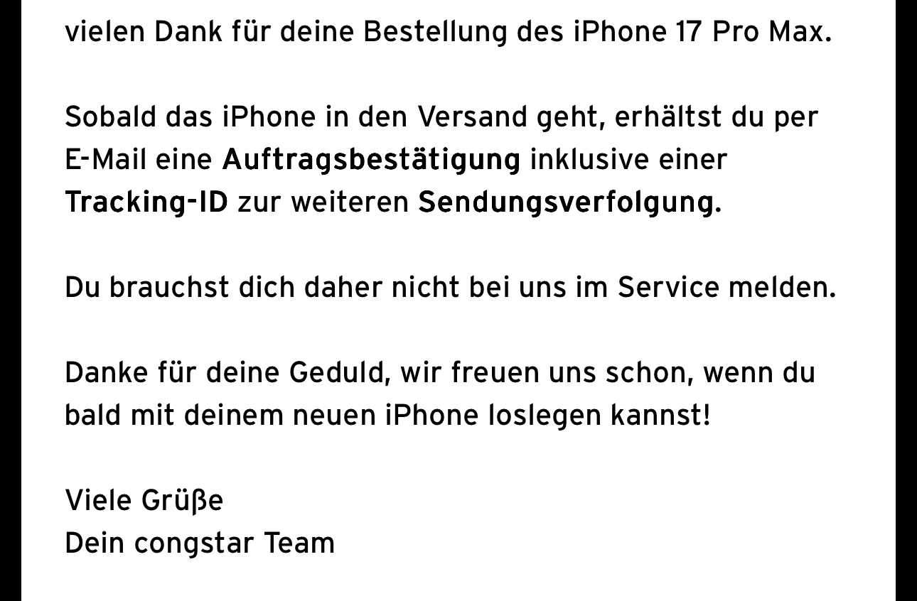 Hab jetzt auch meine Versandbestätigung für iPhone 17 bekommen. Für den 17 pro Max steht Auftragsverarbeitung.
